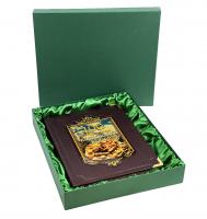 Цельнокожаный переплёт ручной работы, украшен иллюстрированной вставкой из цветного металла.