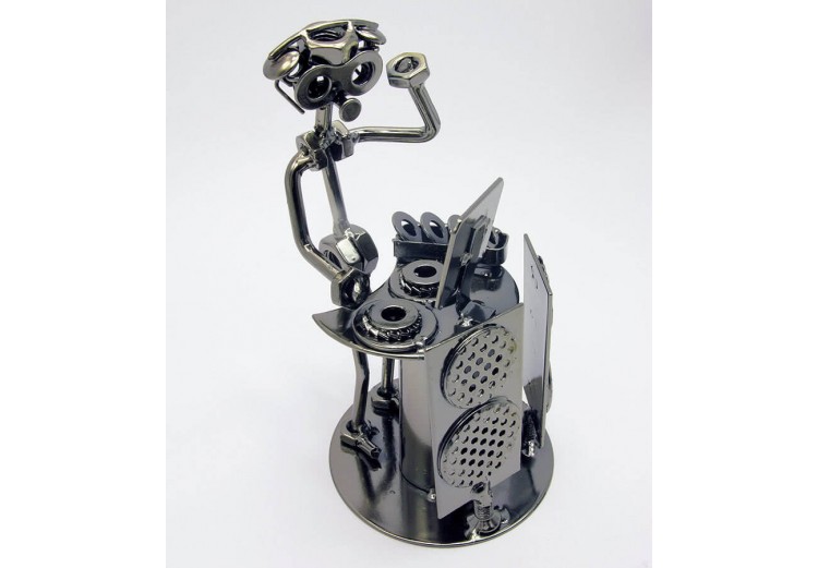 Его причудливые создания из шурупов и болтов, изображающие людей на работе и на отдыхе, узнаются из прочих по приметным очкам, которые они все носят.