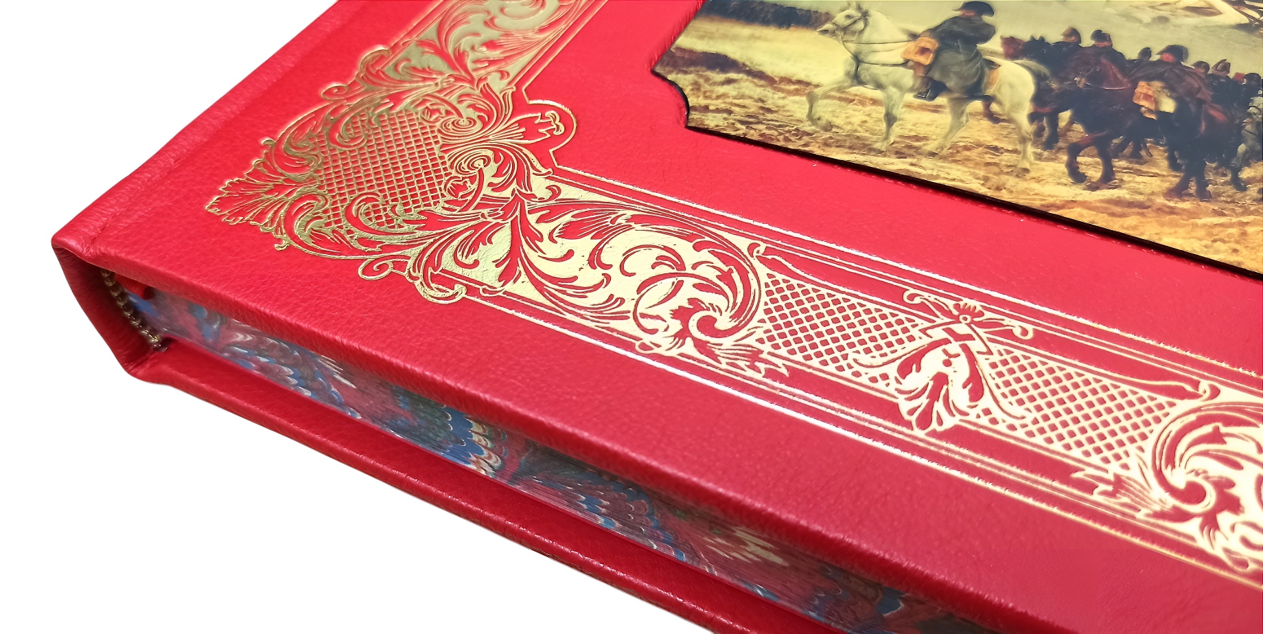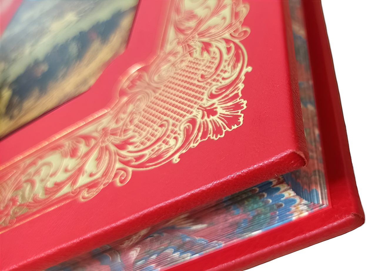Цельнокожаный переплёт ручной работы, украшен иллюстрированной вставкой из цветного металла и золотым тиснением.
