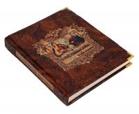 Цельнокожаный переплёт ручной работы, украшен иллюстрированной вставкой из цветного металла.