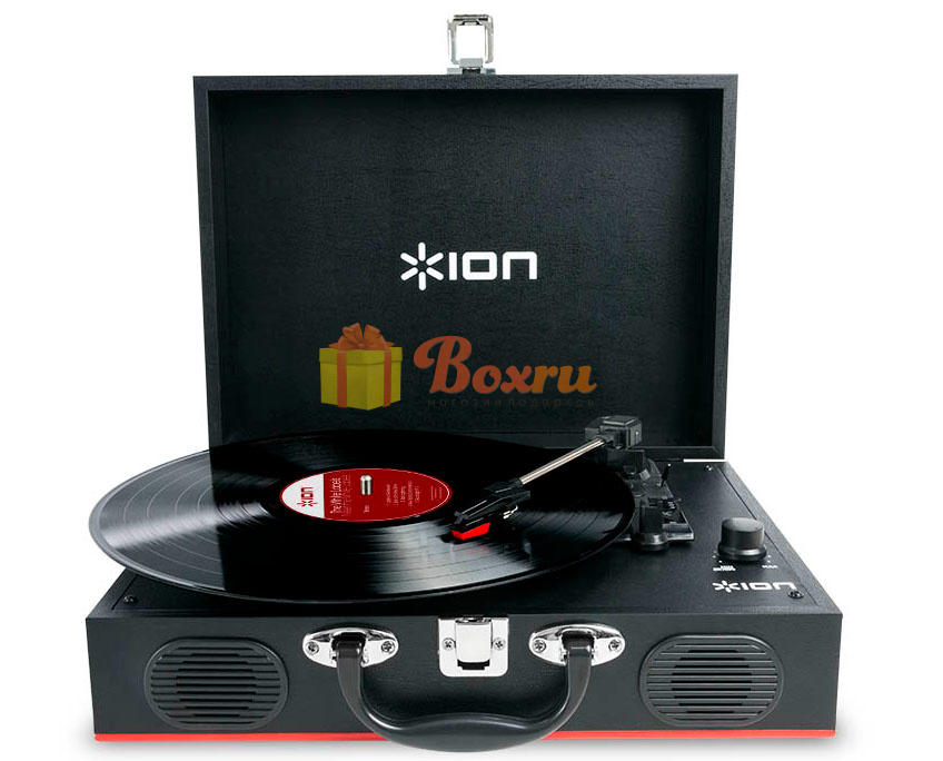 Виниловый проигрыватель со встроенными динамиками и встроенным аккумулятором работающим до 4-х часов без подзарядки.