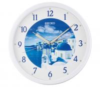 Настенные часы в корпусе круглой формы с изображением городского пейзажа и моря, арабские цифры.