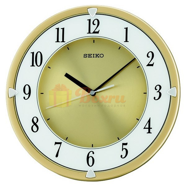 Круглый корпус выполнен из качественного пластика золотистого цвета - этот материал прослужит Вам долгие годы и сохранит свой первоначальный вид. Круглый циферблат классического белого цвета с круглой золотистой вставкой в центре.
