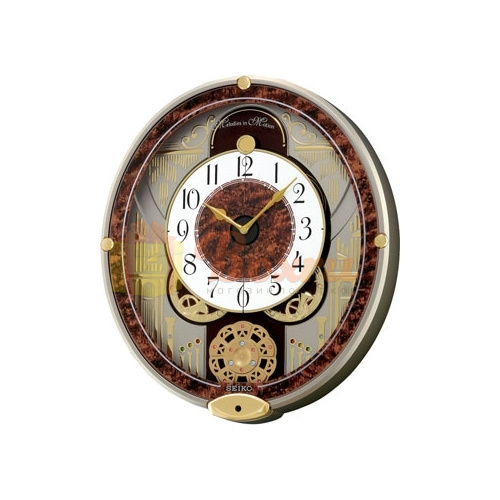Циферблат белого цвета, часовая, минутная и секундная стрелки. Временные рамки обозначены большими арабскими цифрами Вращающийся маятник. Светодиодная подсветка. 6 мелодий каждый час.В конце каждого часа под музыку циферблат вращается и раскладывается на части. Автоматическое отключение мелодии. Регулировка громкости.