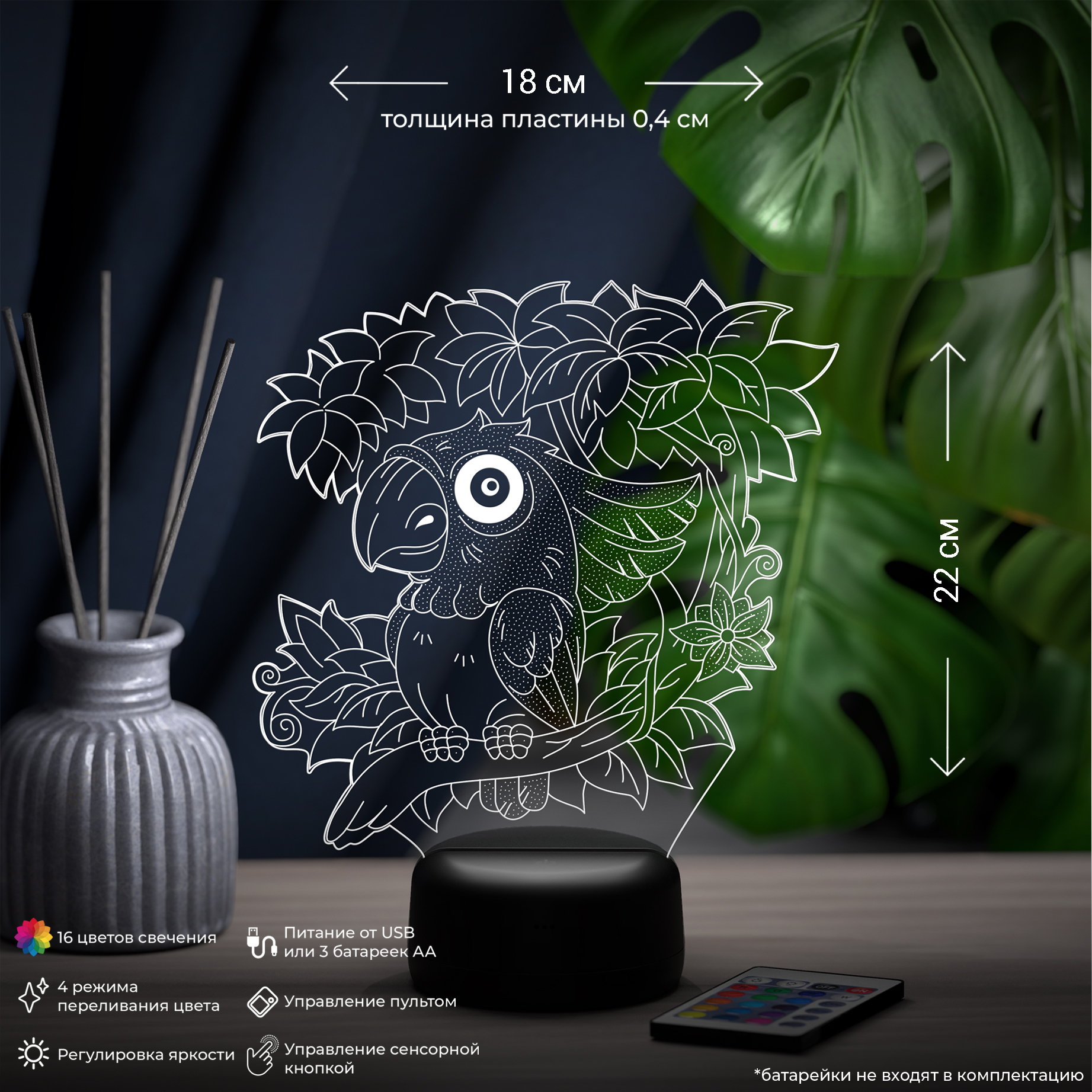 3D ночник Попугай на веточке
