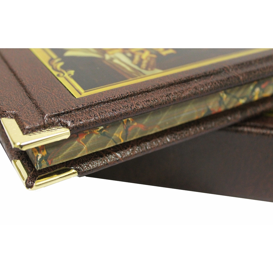 Книга представлена в подарочном футляре, оформленном металлическими вставками с изображением, соответствующим тематике издания.