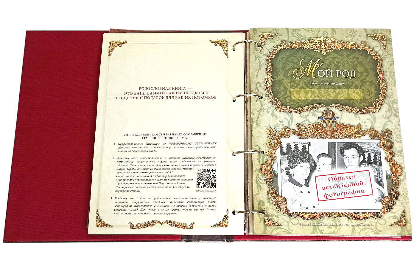 - QR-код (расположен на сертификате), который открывает программу с шаблонами для печати и самостоятельного заполнения чистых бланков, примерами родословной книги и программой для построения генеалогического древа.