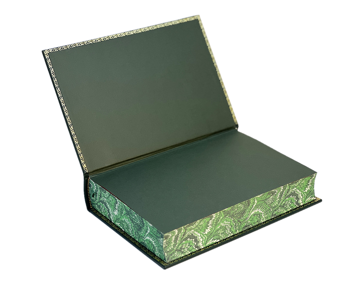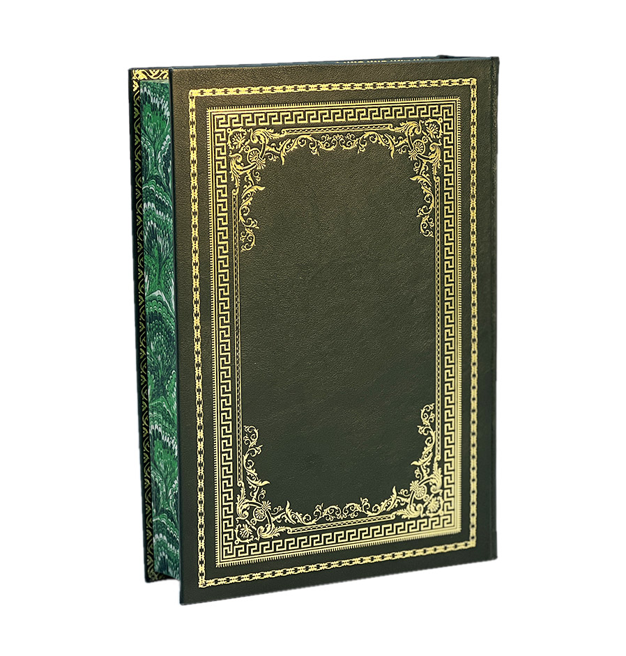 Цельнокожаный переплёт ручной работы, украшен золотым тиснением и художественной кожаной вставкой.