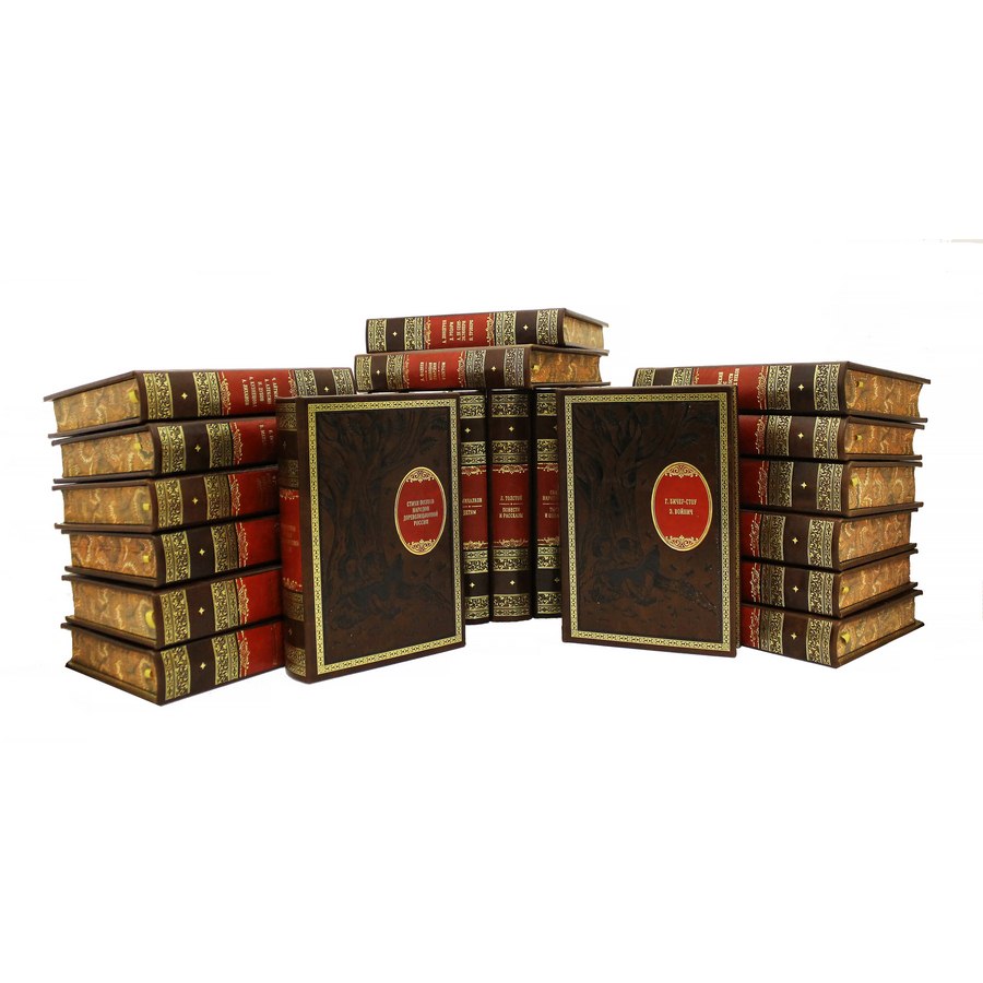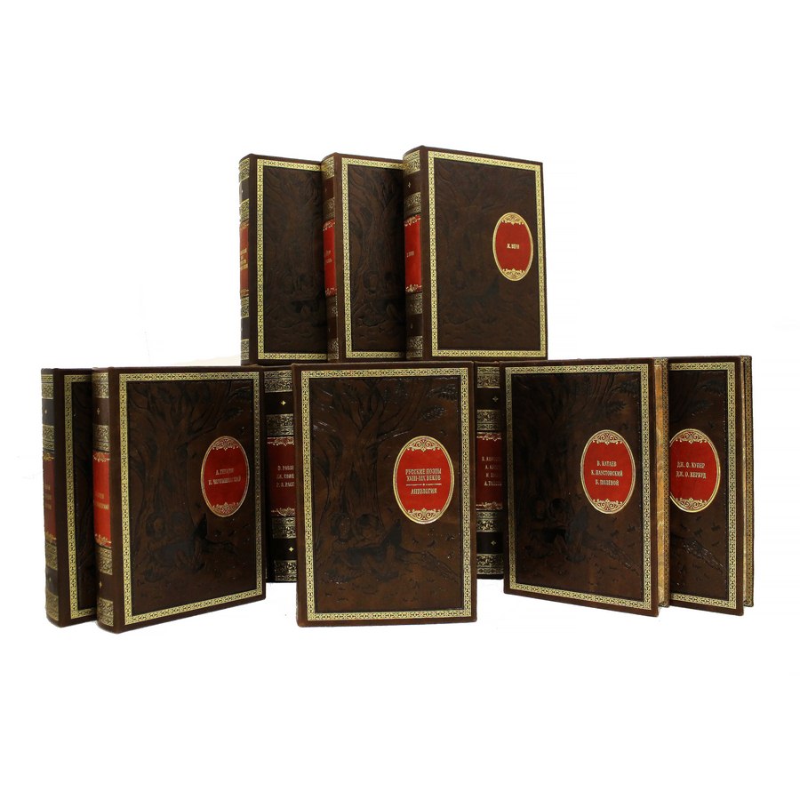Оригинальный дизайн данного букинистического собрания представлен сочетанием цветного, блинтового и золотого тиснения, выполненных на высококачественной натуральной коже.