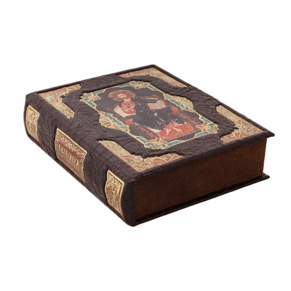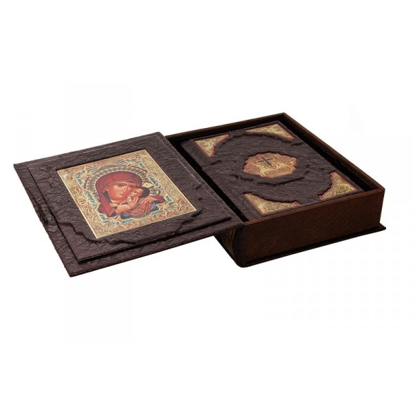 Цельнокожаный переплёт ручной работы, украшен иллюстрированной вставкой из цветного металла.