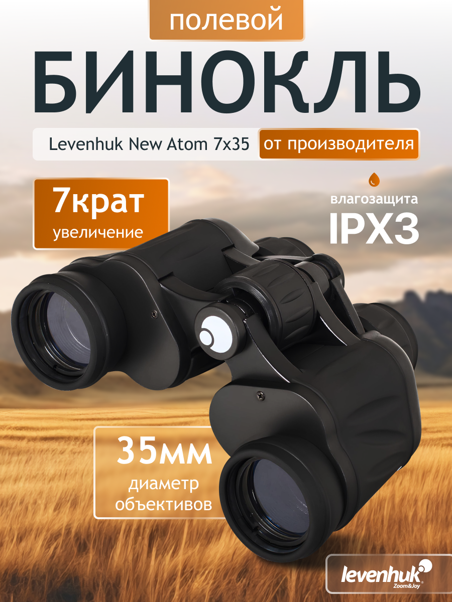 Levenhuk New Atom 7x35 защищен от воды по стандарту IPX3. Это означает, что ему нипочем мокрый снег или умеренный дождь, но окунать в воду прибор не следует. Производитель предусмотрел возможность установки бинокля на штатив, для этого необходимо самостоятельно приобрести адаптер для резьбы 1/4". В комплекте с прибором есть все необходимое – ремешок, салфетка для очистки линз, защитные крышки для оптики и чехол для хранения и транспортировки.