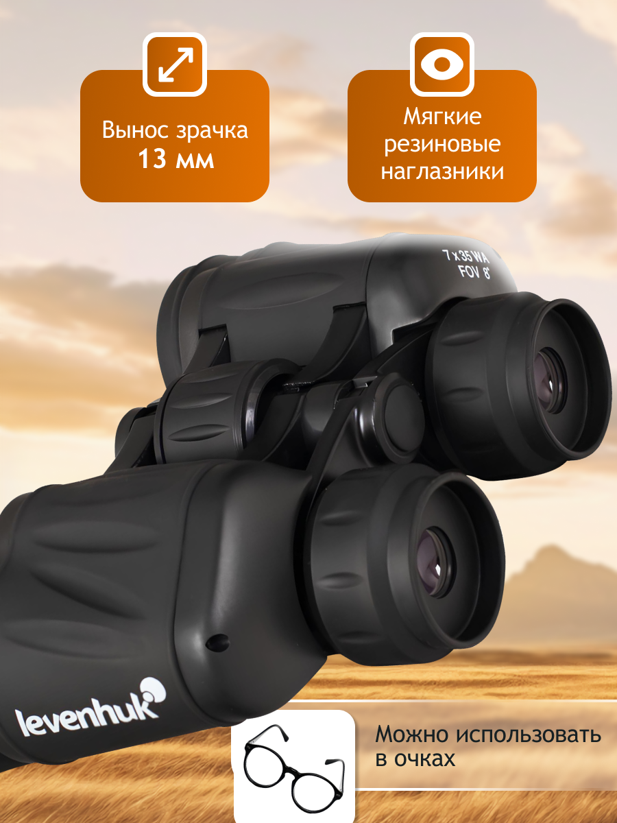Апертура бинокля – 35 мм, увеличение 7-кратное. На оптику, изготовленную из боросиликатного стекла BK-7, нанесено просветляющее покрытие. Это позволяет изображению оставаться детализированным и контрастным в пасмурную погоду или даже в сумерках. Работа с биноклем интуитивно понятна и максимально комфортна. Резкость наводится большим барабаном, расположенным в центре конструкции бинокля. Поверхность барабана также покрыта рельефной резиной для удобства пользования влажными руками или в перчатках. Диапазон настройки межзрачкового расстояния вполне стандартный, в пределах 56–72 мм. При наличии незначительной близорукости или дальнозоркости можно подкорректировать диоптрии в диапазоне ±3 D.