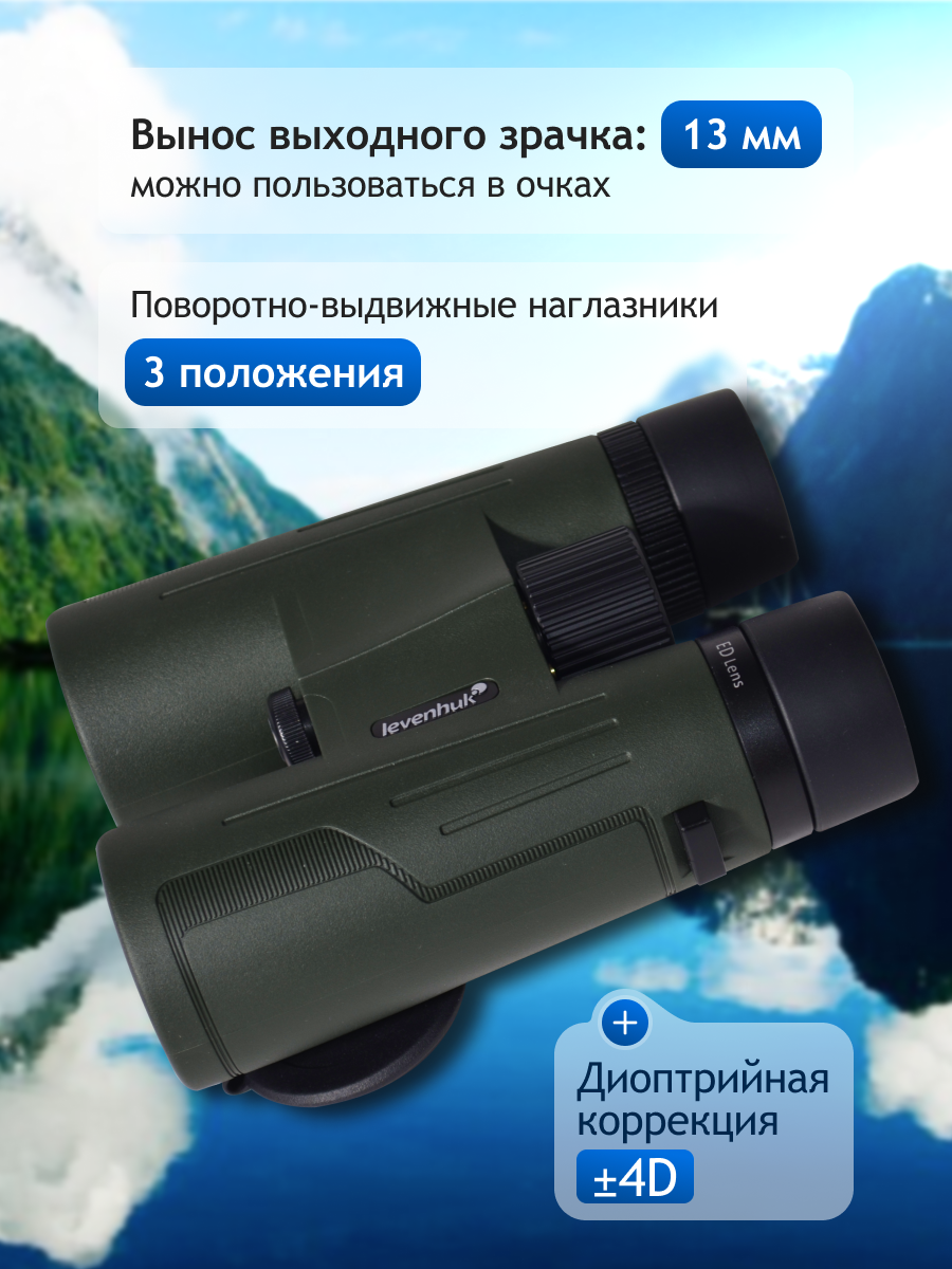 Корпус Levenhuk New Karma PRO ED 12x42 изготовлен из PPS-пластика – ударопрочного, формоустойчивого и термостойкого материала, которому не смогут навредить никакие факторы окружающей среды. Бинокль можно подстроить под индивидуальные физиологические особенности: межзрачковое расстояние меняется в диапазоне 56–74 мм, диоптрии настраиваются в пределах ±4 D, а поворотно-выдвижные наглазники можно зафиксировать в одном из трех предусмотренных положений.