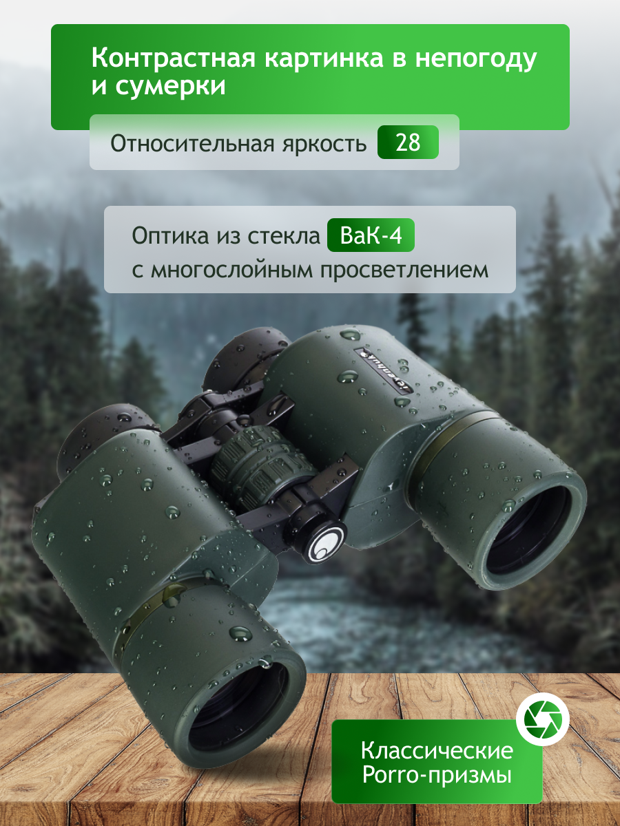 Перед вами 8-кратный прибор с просветленной оптикой из BaK-4, собранный на Porro-призмах. Одно из его главных преимуществ – самое широкое поле зрения в линейке – 142 м на удалении 1000 м. Это прекрасный показатель для поисков на открытой местности, рассмотрения звездного неба и наблюдения за быстро движущимися объектами.