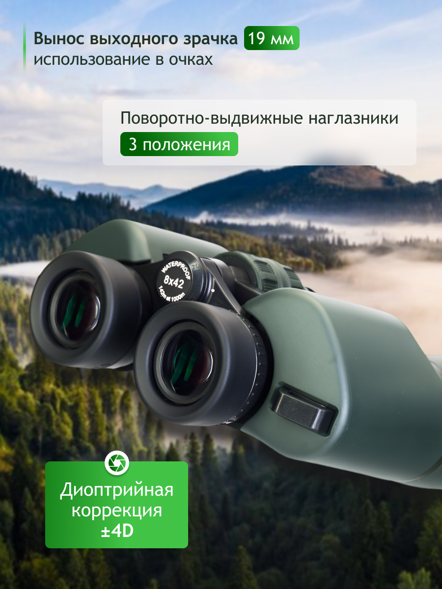 Для настройки бинокля под нужды пользователя используются регулировка межзрачкового расстояния, корректировка диоптрий и выбор наиболее удобного положения поворотно-выдвижных наглазников. Благодаря системе «клик-стоп» наглазники могут занимать одно из 3 положений фиксаций.