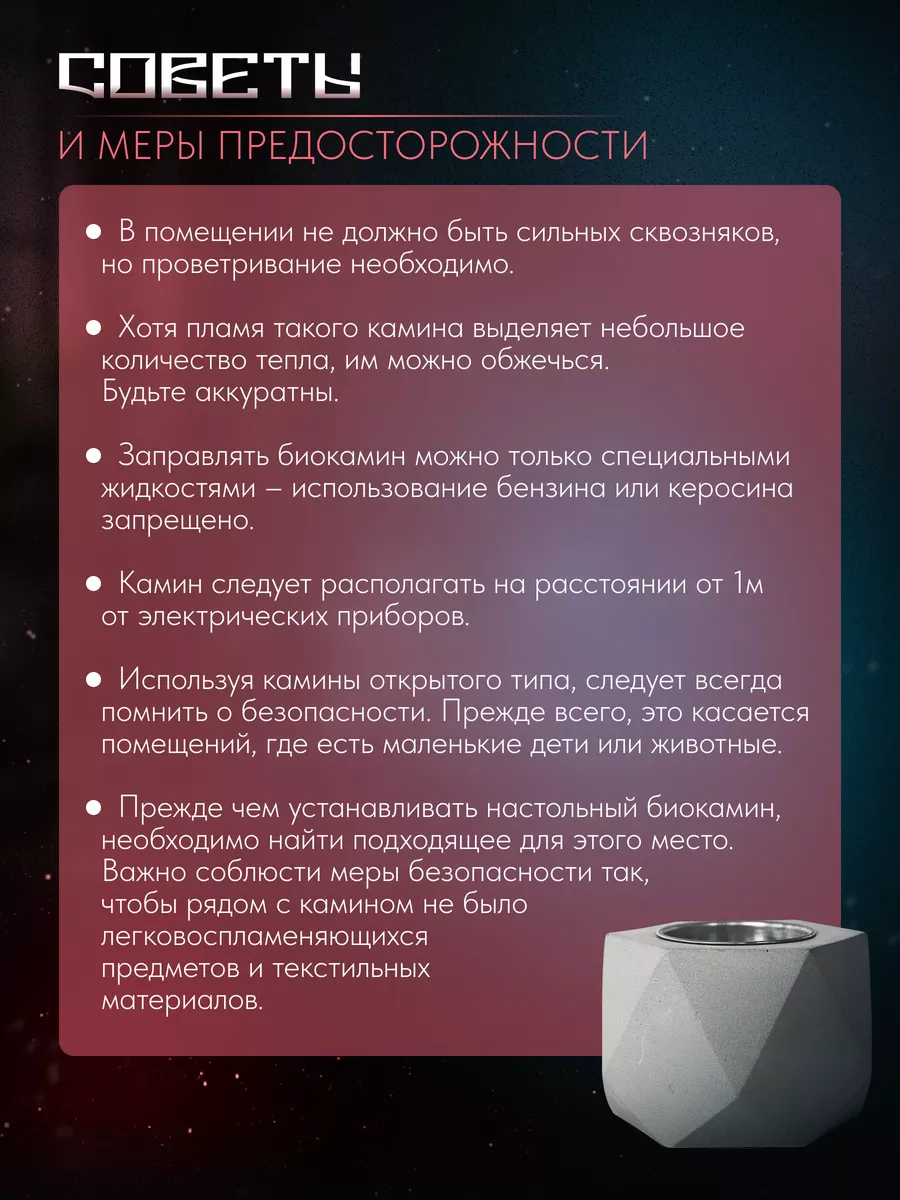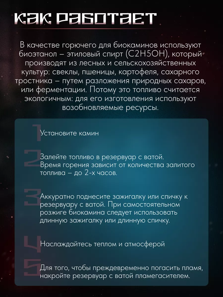 *Заполнять камин топливной жидкостью можно только когда огонь потушен! Не оставляйте маленьких детей без присмотра возле горящего биокамина!