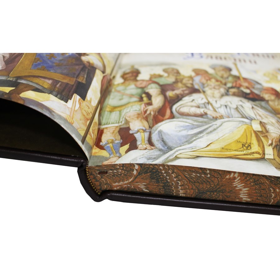 Дизайн прекрасно сочетает в себе золотое и блинтовое тиснение, художественную металлическую вставку, соответствующую тематике издания, а также крашенный в тон переплетного материала обрез.