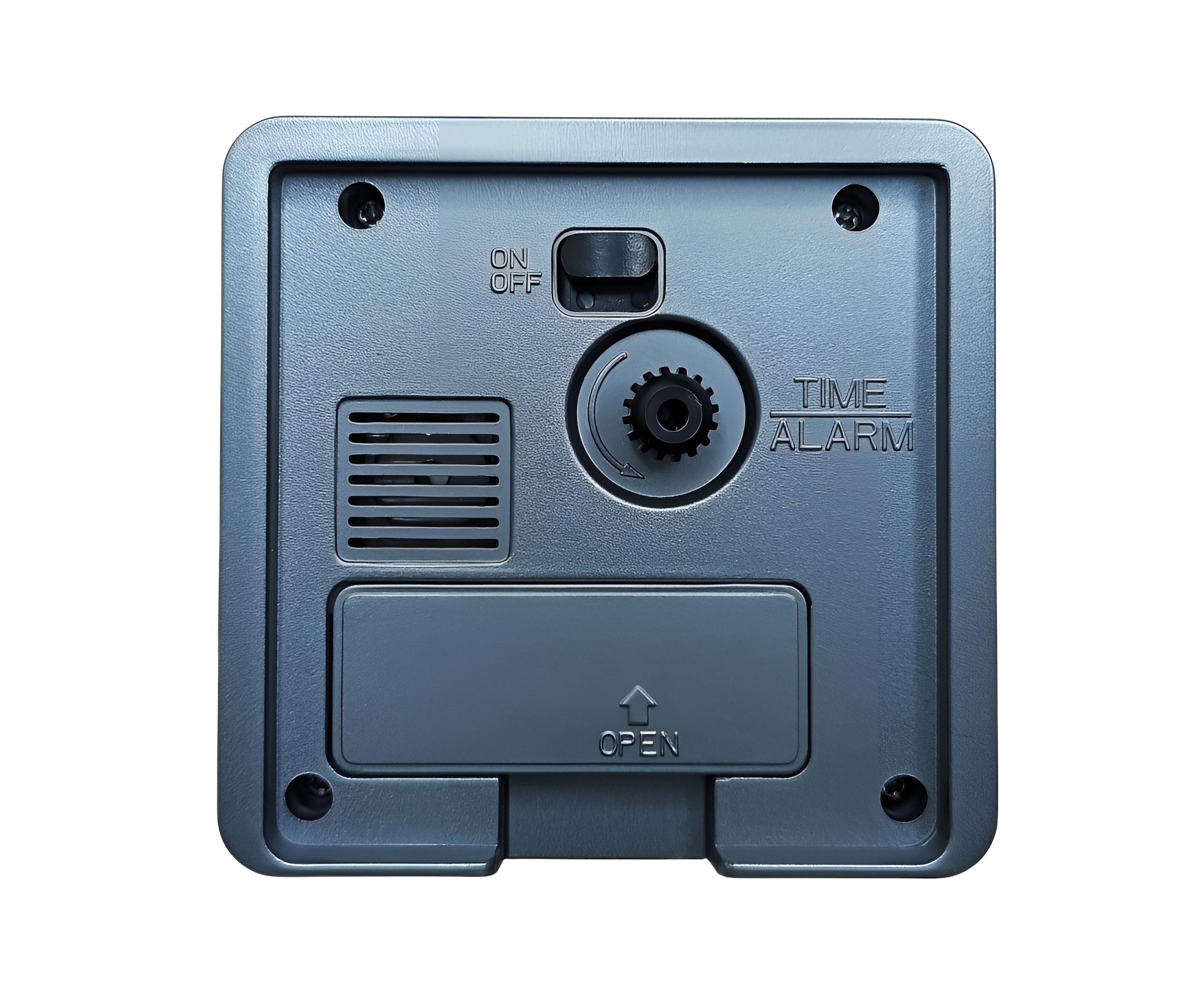 Современный настольный будильник в квадратном корпусе.