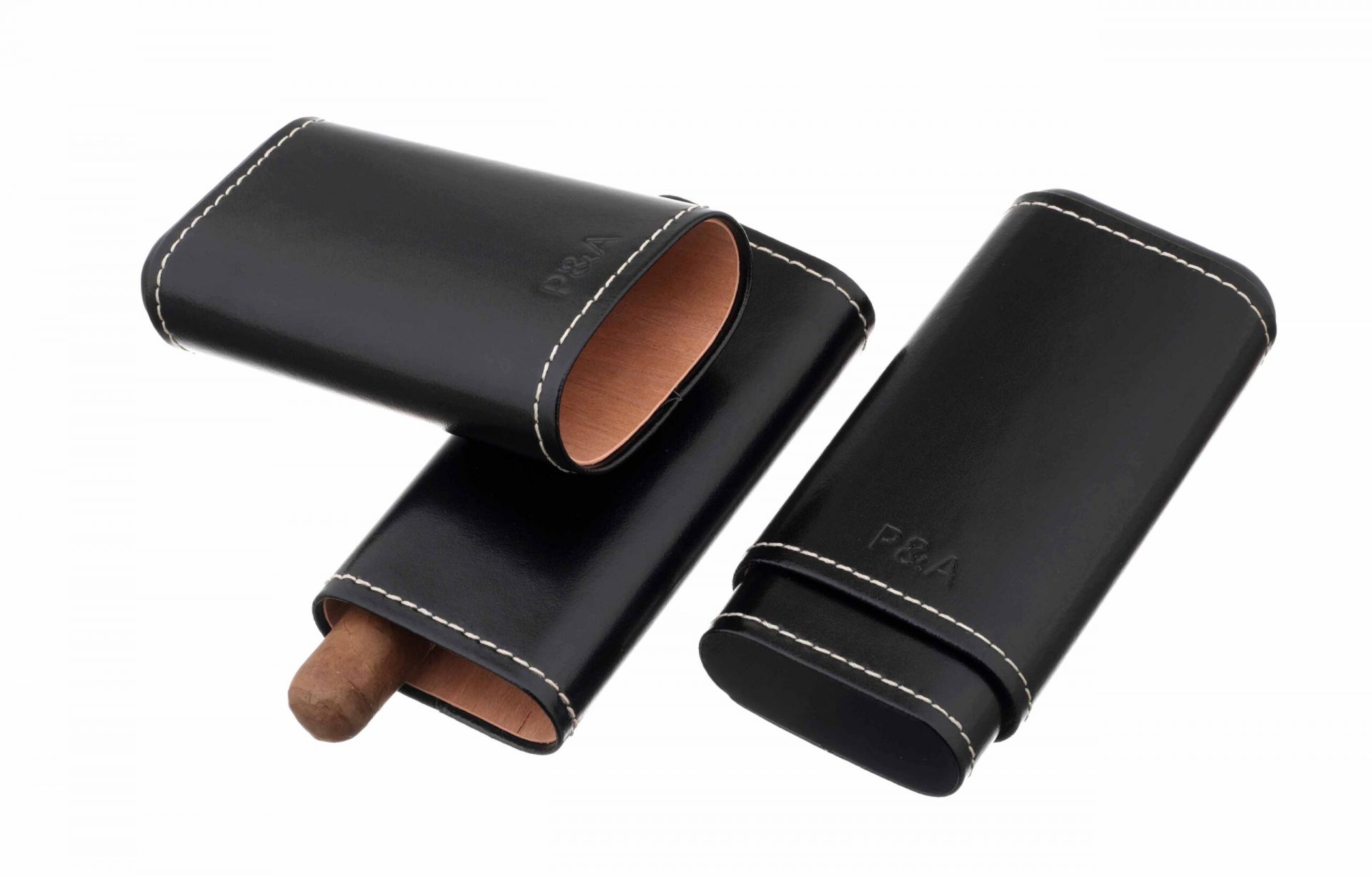 Чехол сигарный P&A в жестком корпусе из кедра и натуральной телячьей кожи. Эта серия недорогих, но очень качественных сигарных аксессуаров производится итальянской компанией Parenti&Agostinelli из Милана. Раздвижной чехол имеет вставку из испанского кедра. Совместно с увлажнителем может служить как дорожный хьюмидор. Вмещает в себя 3 сигары длиной до 19 см и диаметром до 2,4 см (ring gage 60) формата Черчилль, Робусто и Торпедо.