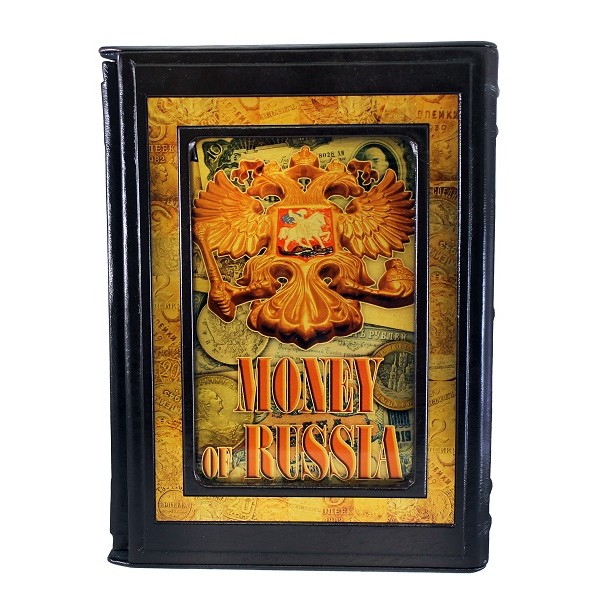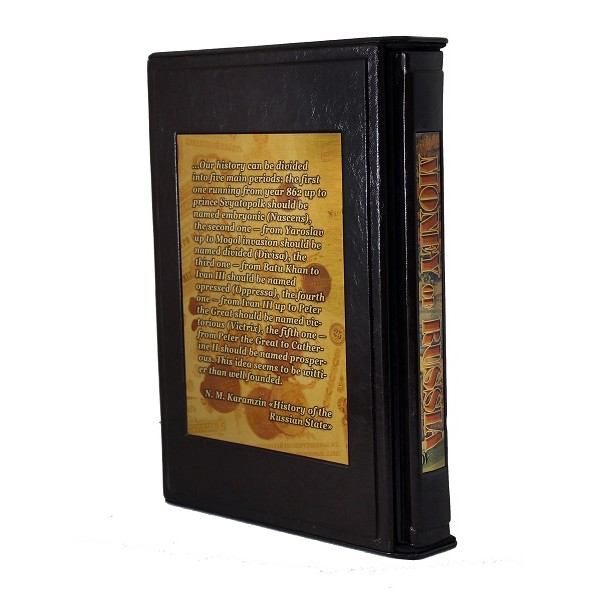 Цельнокожаный переплёт ручной работы, украшен иллюстрированной вставкой из цветного металла.