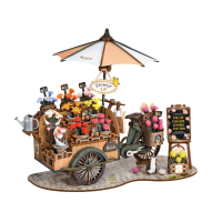 Цветы поднимают настроение, поэтому купите букет для себя или своего любимого человека в «Цветочной тележке». Эта головоломка из 187 деталей представляет собой деревянную тележку в винтажном стиле, прикреплённую к велосипеду с вращающимися колёсами, чтобы перевозить покупки для довольных покупателей на рынке. У тележки есть зонтик, чтобы защитить бутоны от слишком сильного нагрева, и лейка, чтобы сохранить свежесть веточек. Рядом с тележкой установлена доска, чтобы привлечь внимание к цветам, дополненным небольшой корзинкой с ярко-жёлтыми тюльпанами. Кажется, вы привлекли внимание любопытной кошки, которая теперь тихо сидит рядом с тележкой, а также жёлтой бабочки, которая в данный момент сидит на вашей вывеске. С какой бы стороны вы ни посмотрели на эту тележку, она просто неотразима. С какой бы стороны вы ни посмотрели на эту тележку, она просто неотразима. Это отличный декор в местах, где люди могут обозревать окрестности на 360 градусов или просто как дополнение к другим вашим миниатюрным домикам Rolife и книжным уголкам.