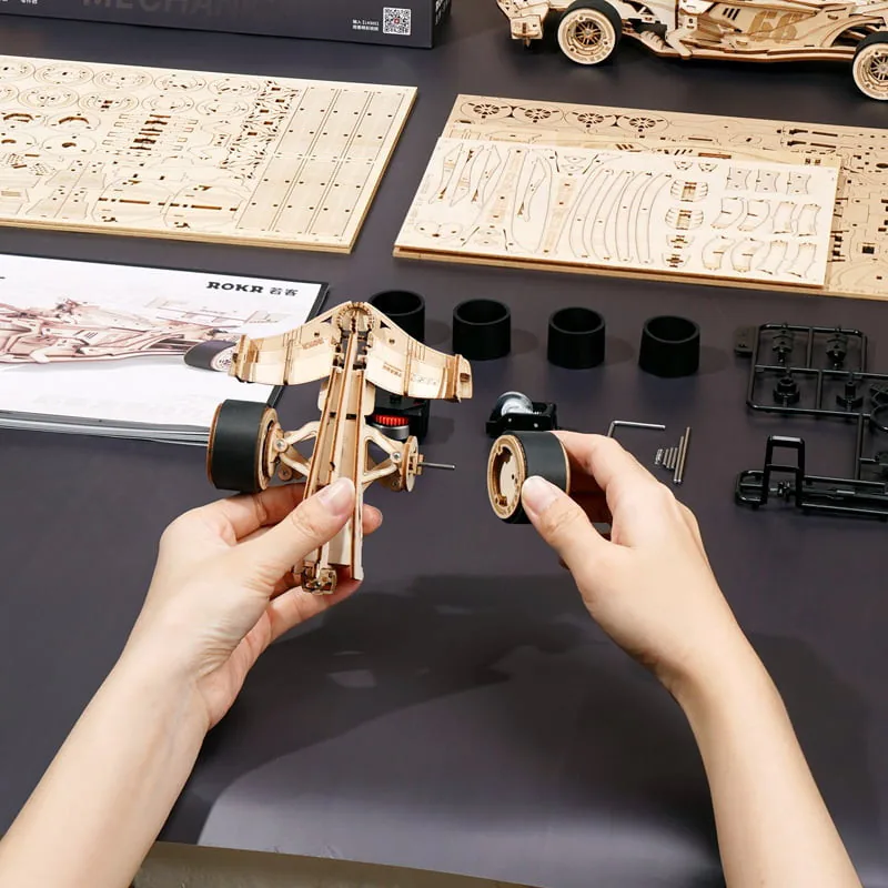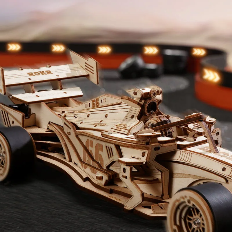 Приготовьтесь к захватывающей поездке на гоночном автомобиле, новейшей 3D-деревянной головоломке от ROKR. Эта модель, вдохновлённая Формулой-1, подарит вам острые ощущения и увлекательное путешествие. Её обтекаемый аэродинамичный дизайн и детально проработанная деревянная рама включают в себя обтекаемое переднее крыло, знакомый задний спойлер, заострённый нос, низкий клиренс и тесную кабину с местом для водителя. Дополнительную реалистичность придают открытые механические шестерни и компоненты двигателя, демонстрирующие планетарную зубчатую передачу, которая обеспечивает плавные повороты и движение дифференциала, особенно когда прочные силиконовые колёса сталкиваются с препятствиями. В нём также есть звуковая коробка, которая имитирует звук настоящего двигателя Формулы-1. Этому автомобилю не нужны батарейки! Просто поверните ключ и наблюдайте, как он мчится вперёд. Независимо от того, поставите ли вы его на стол или будете гонять по полу, ROKR Racing Car разожжёт в вас страсть к инженерному делу, дизайну и покорению финишной черты!