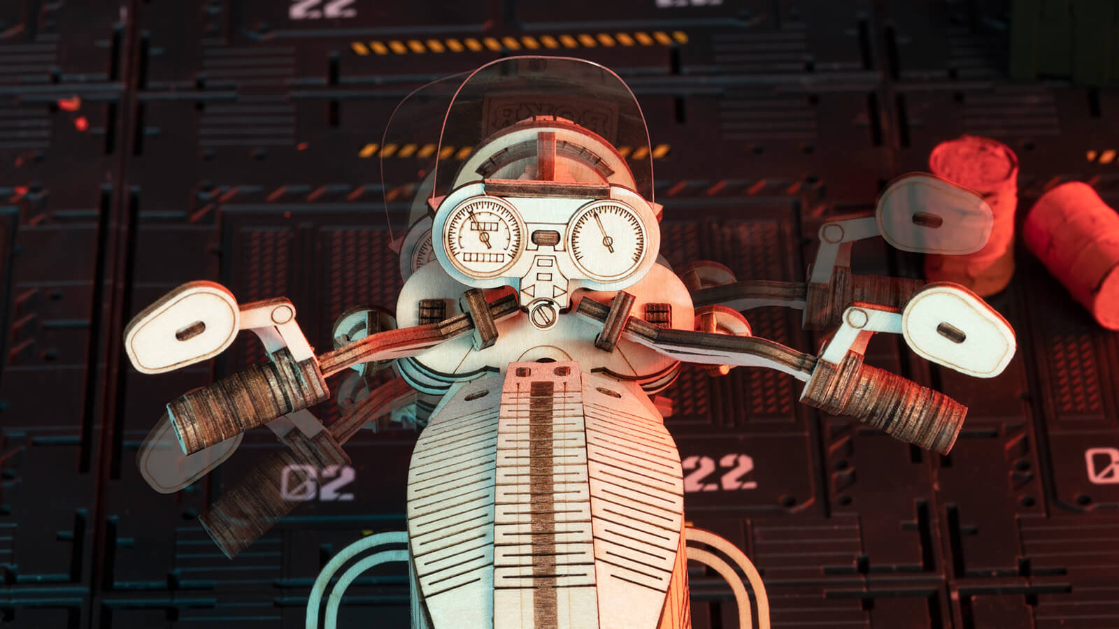 Сборная деревянная модель классического ретро-байка с V-образным 4-цилиндровым двигателем с рабочими поршнями, амортизацией, поворотным рулём, 2-мя задними открывающимися кофрами, двойным режимом движения/статики, с двигателем на металлической пружине и дальностью хода до 3 метров.