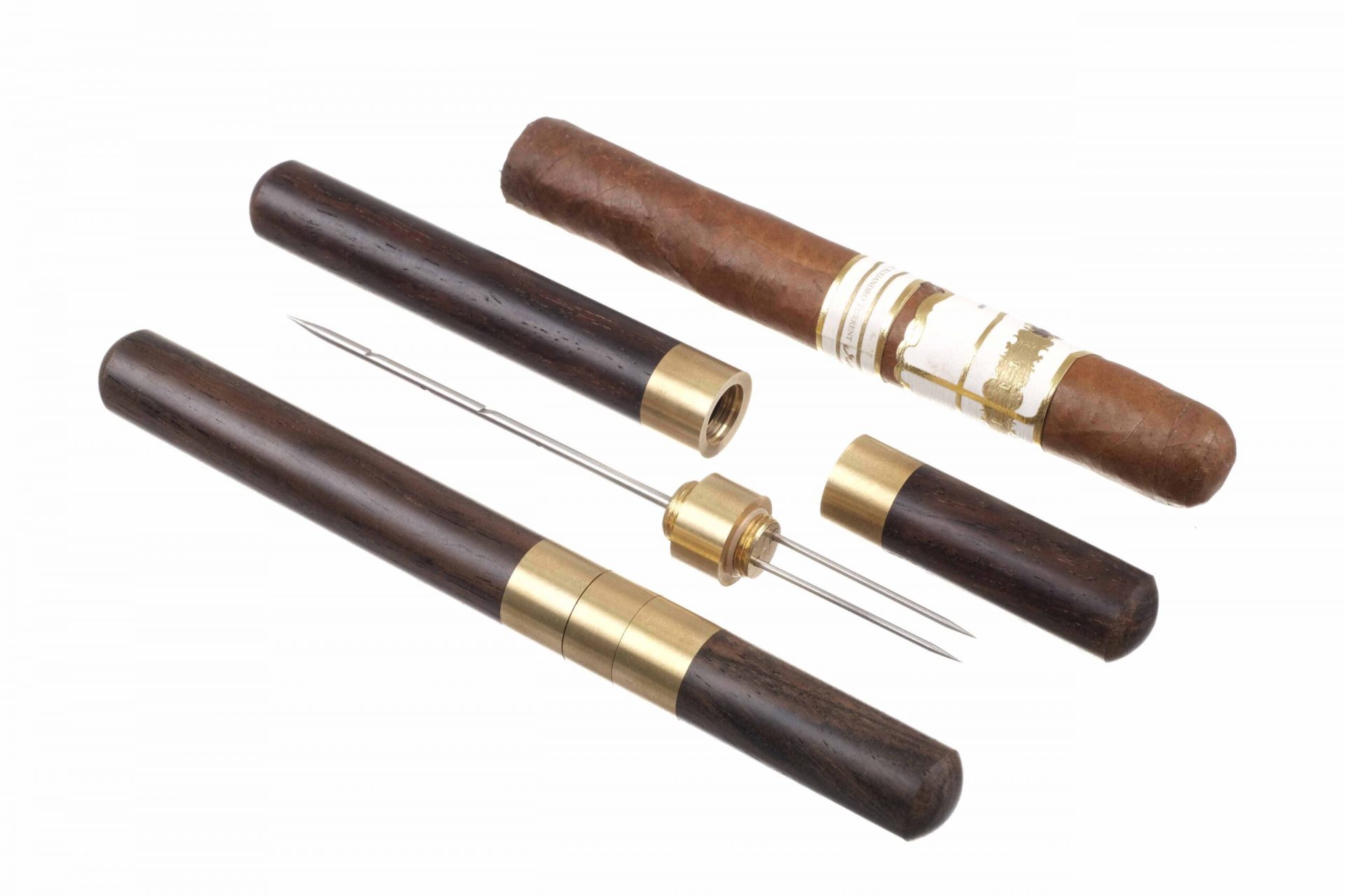 Новинка от известного немецкого табачного бренда Passatore: сигарный компаньон 2 в 1: шило с засечками длиной 90 мм для прокалывания сигары и улучшения тяги, а также докуриватель с двумя иглами в 40 мм. Изготовлено из нержавеющей стали с отделкой латунью и Эбеновым деревом. Для сигар любого размера.