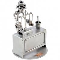 Его причудливые создания из шурупов и болтов, изображающие людей на работе и на отдыхе, узнаются из прочих по приметным очкам, которые они все носят.