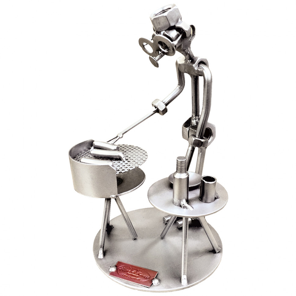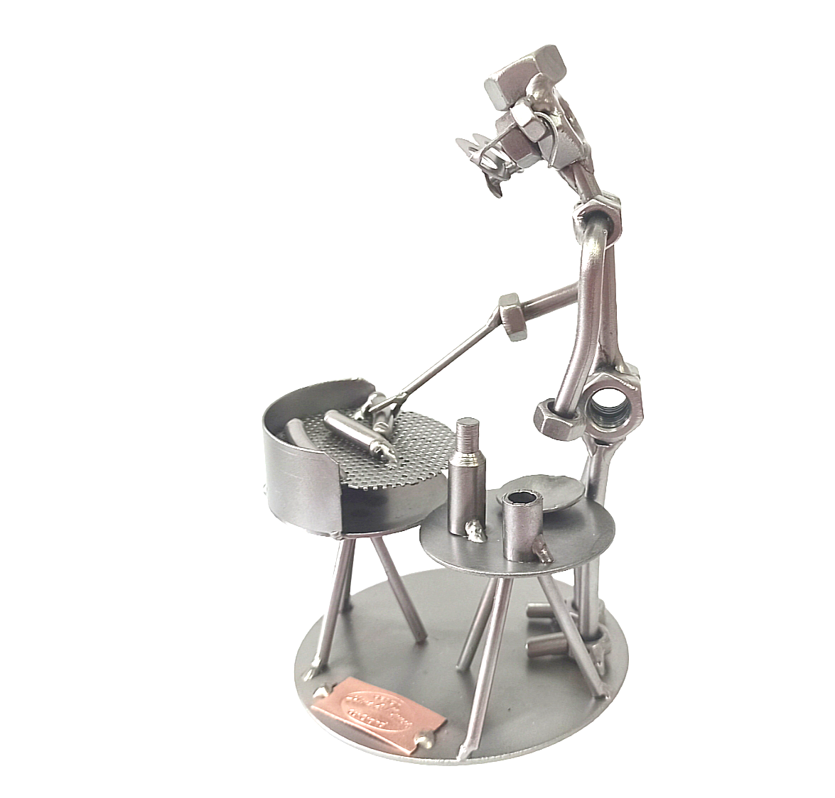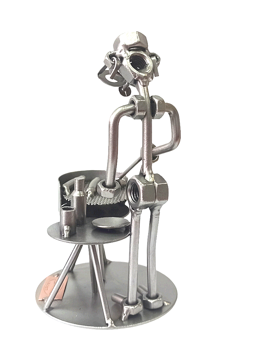 Его причудливые создания из шурупов и болтов, изображающие людей на работе и на отдыхе, узнаются из прочих по приметным очкам, которые они все носят.