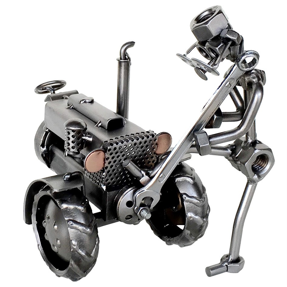 Его причудливые создания из шурупов и болтов, изображающие людей на работе и на отдыхе, узнаются из прочих по приметным очкам, которые они все носят.
