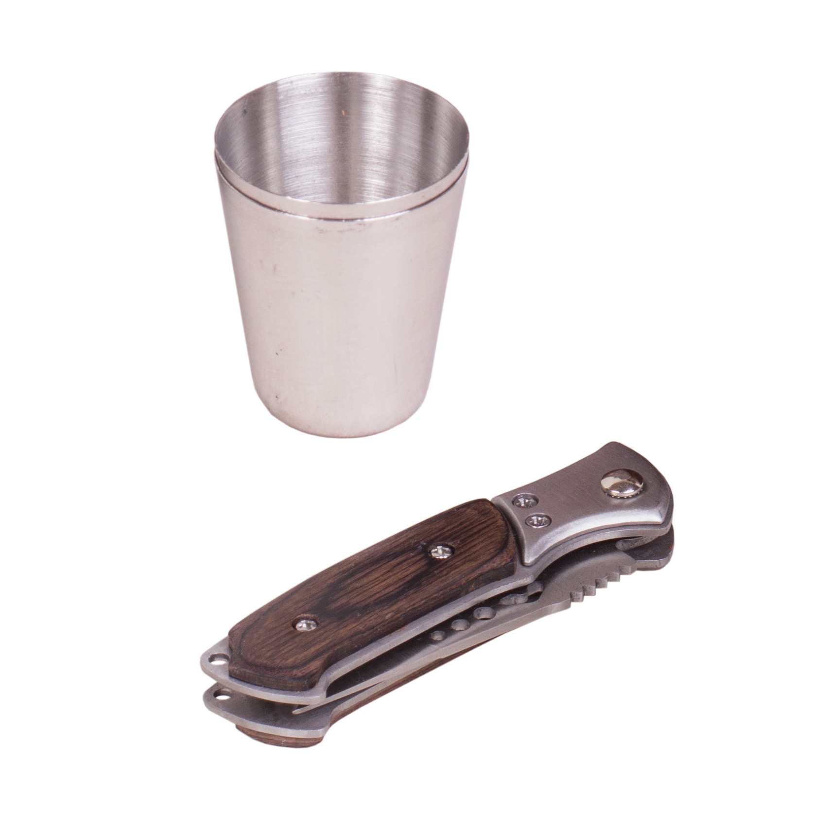В накладных кармашках, закрывающихся на кнопки, расположены 2 стаканчика из полированной пищевой стали и складной нож.