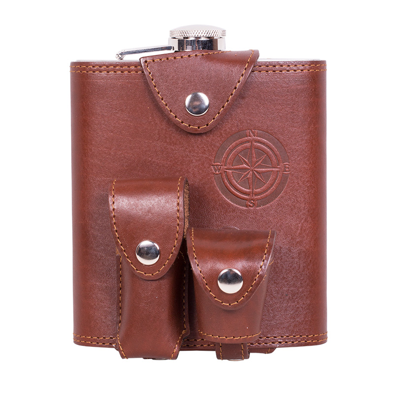 Подходит для охотников, рыбаков и туристов.1. | Фляга из шлифованной нержавеющей стали, объем 0,5 л, в чехле из натуральной кожи с тиснением рисунка | 1 шт. |