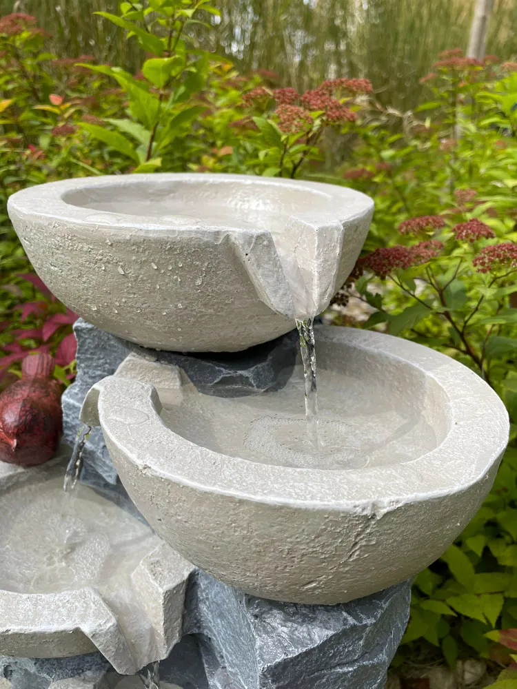 Этот фонтан с каскадными чашами станет идеальным дополнением к вашему декору и подойдет для использования в саду, патио, на террасе или во дворе.