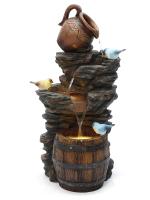 Декоративный фонтан представляет собой композицию, вершину которой венчает "глиняный" кувшин, из которого струится вода, каскадом стекая по многоуровневой конструкции из сложенных камней вниз и там наполняет "деревянную" бочку, стоящую у основания.