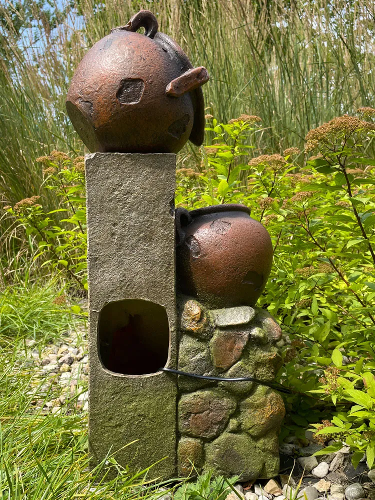 Фонтан, современного дизайна с ноткой деревенского шарма и текстурой камня, выполнен из прочного материала - полирезина, который устойчив к внешним атмосферным воздействиям, ржавчине, растрескиванию и очень долговечен.
