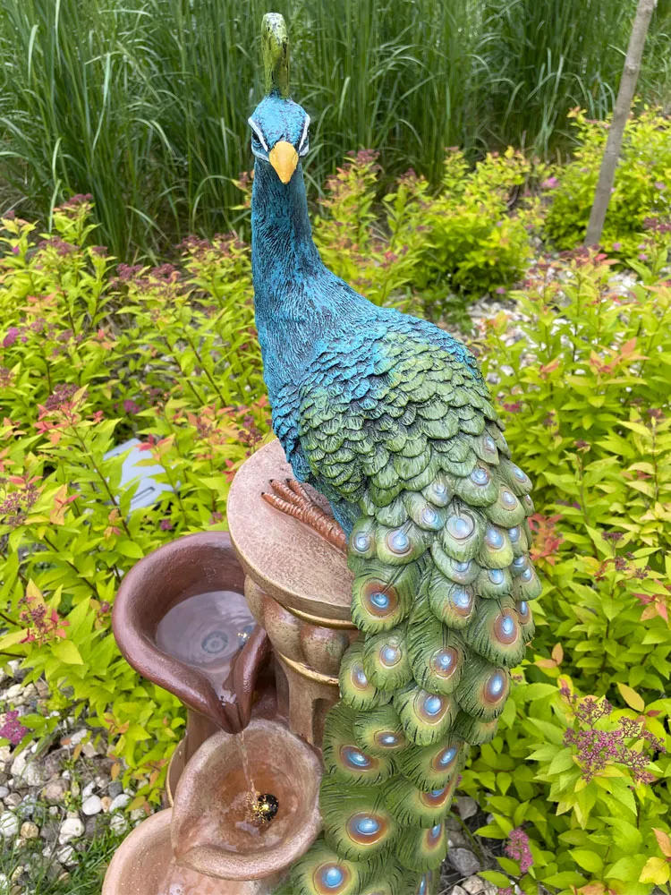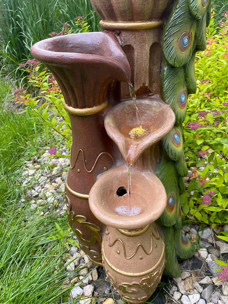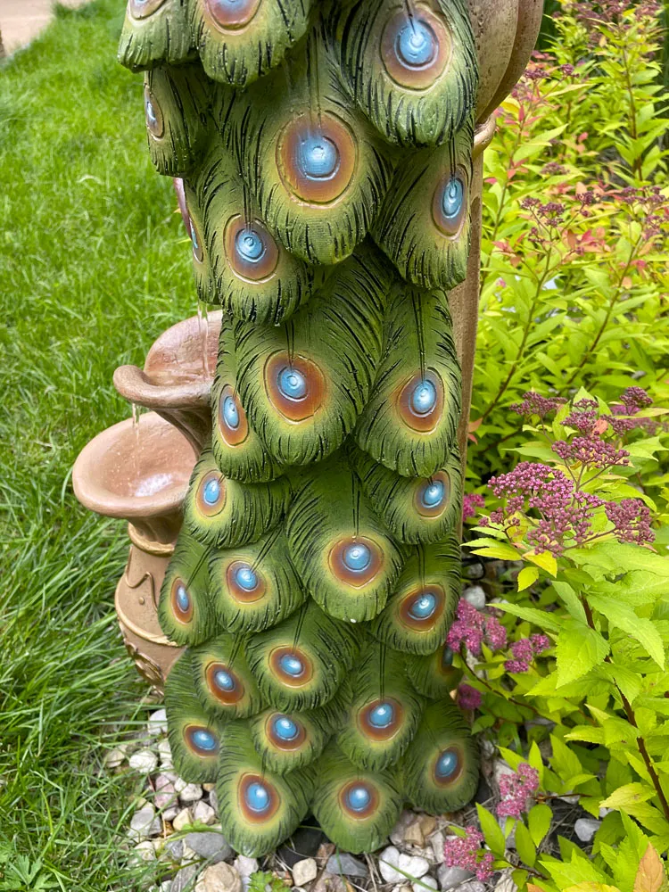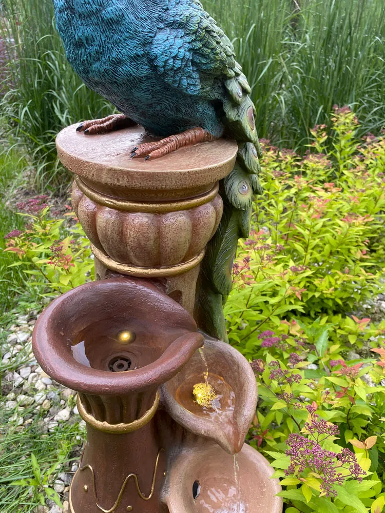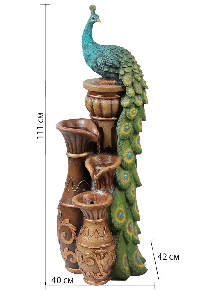Фонтан, выполнен в виде птицы-павлин, как бы присевшую, утолить жажду, из прочного материала - полирезина, который устойчив к внешним атмосферным воздействиям, ржавчине, растрескиванию и очень долговечен.