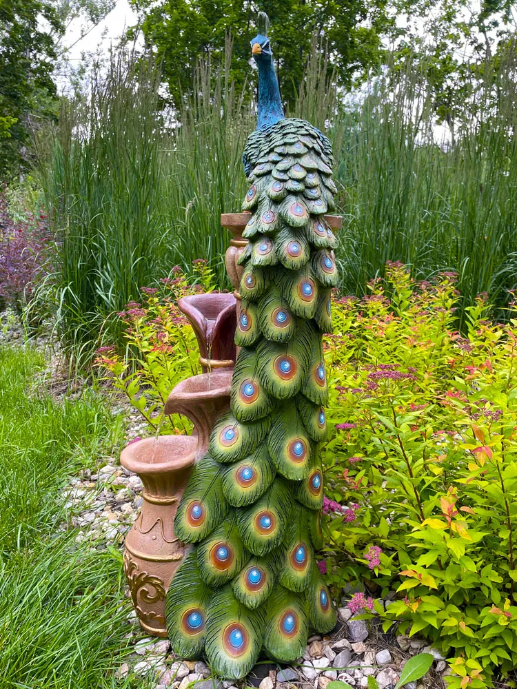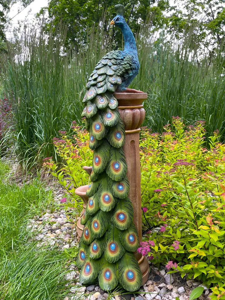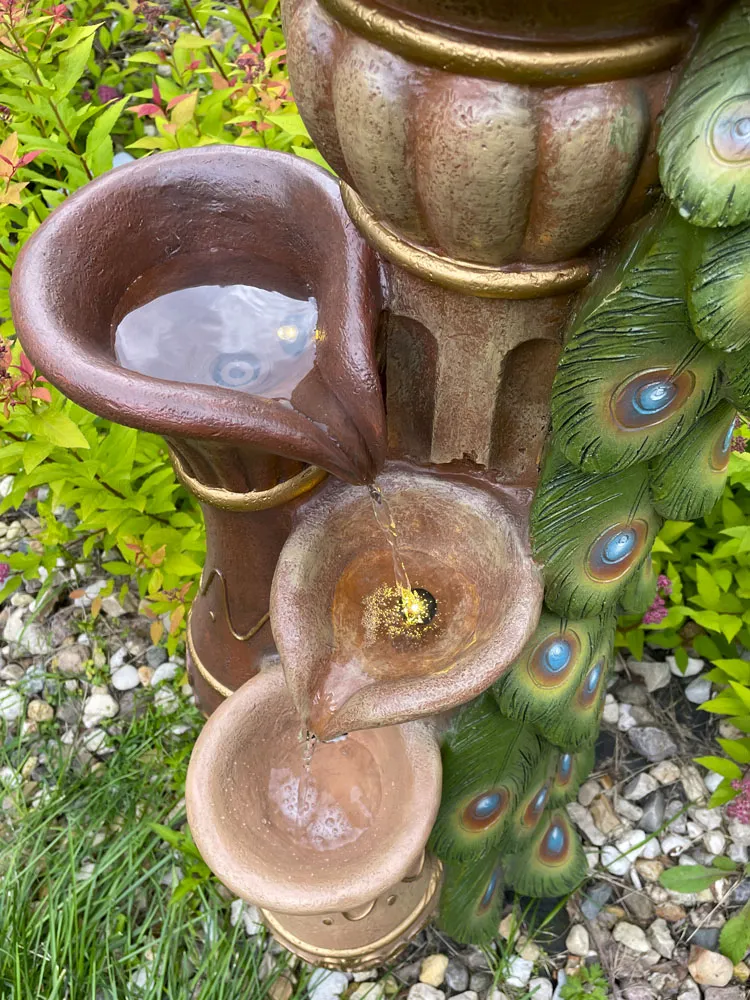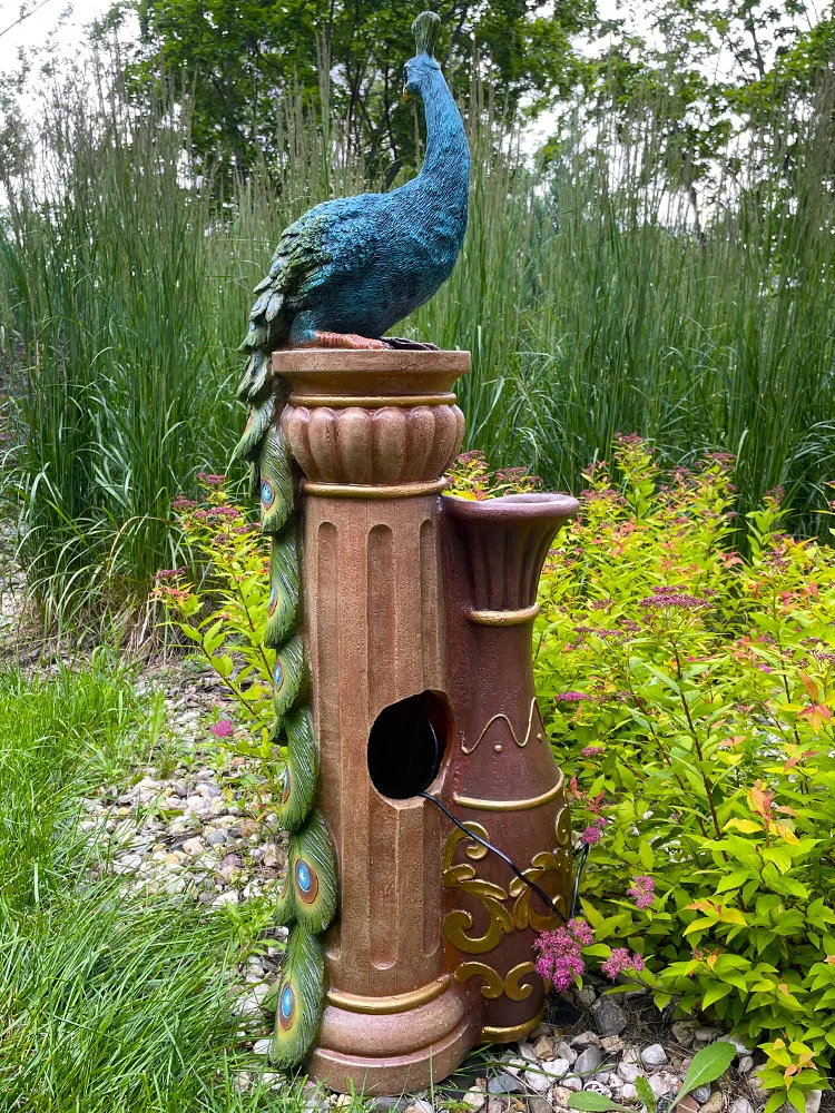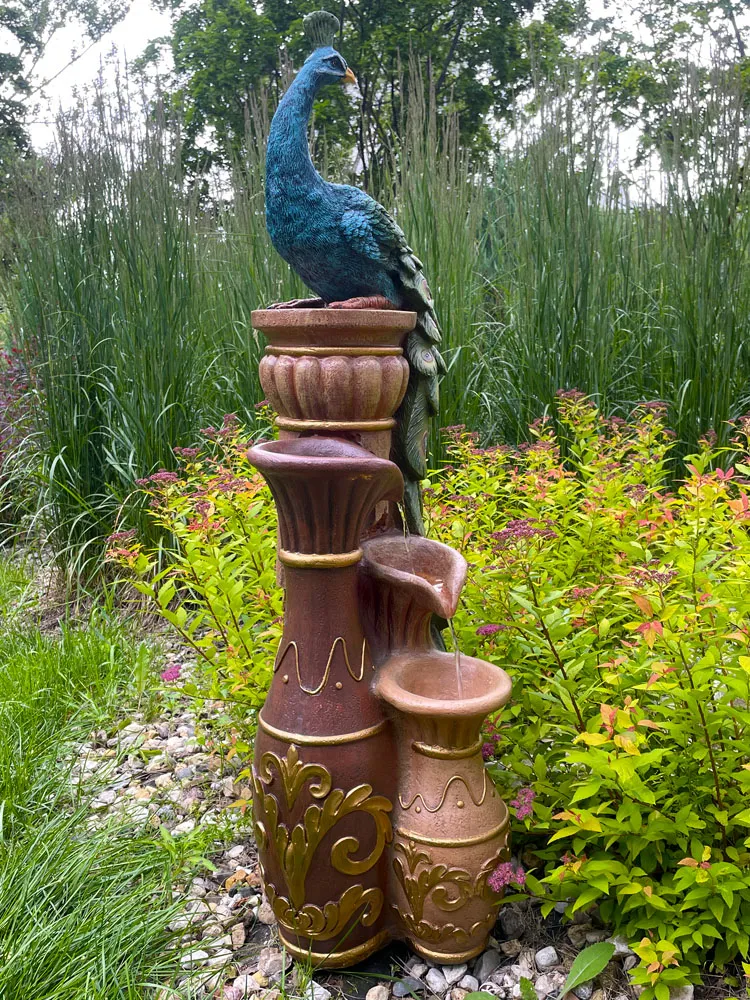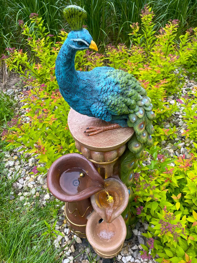 Фонтан, выполнен в виде птицы-павлин, как бы присевшую, утолить жажду, из прочного материала - полирезина, который устойчив к внешним атмосферным воздействиям, ржавчине, растрескиванию и очень долговечен.