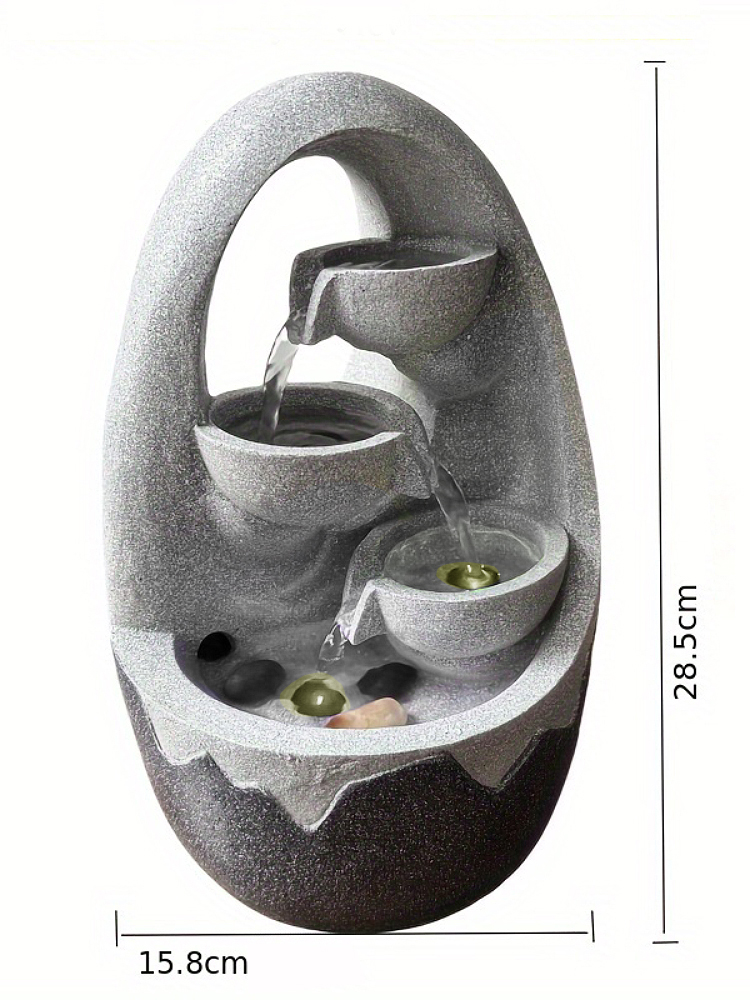 Вода стекает каскадами по каждому ярусу, имитируя звуки настоящего водопада, создавая умиротворяющую атмосферу.