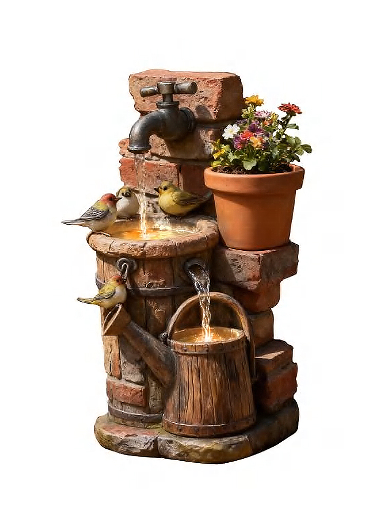 Фонтан выполнен в деревенском стиле из прочного материала - полирезина, который устойчив к внешним атмосферным воздействиям, ржавчине, растрескиванию и очень долговечен.