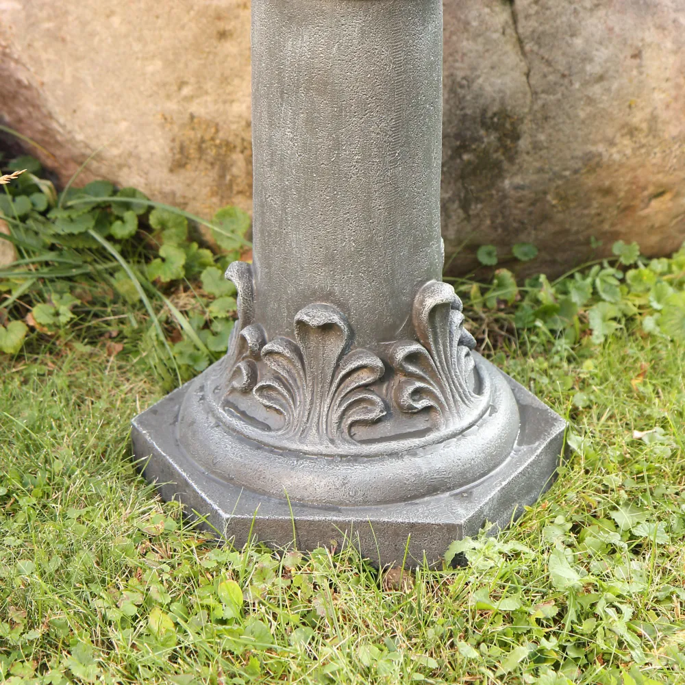 Фонтан выполнен из прочного материала - полирезина серого цвета, который устойчив к внешним атмосферным воздействиям, ржавчине, растрескиванию и очень долговечен.
