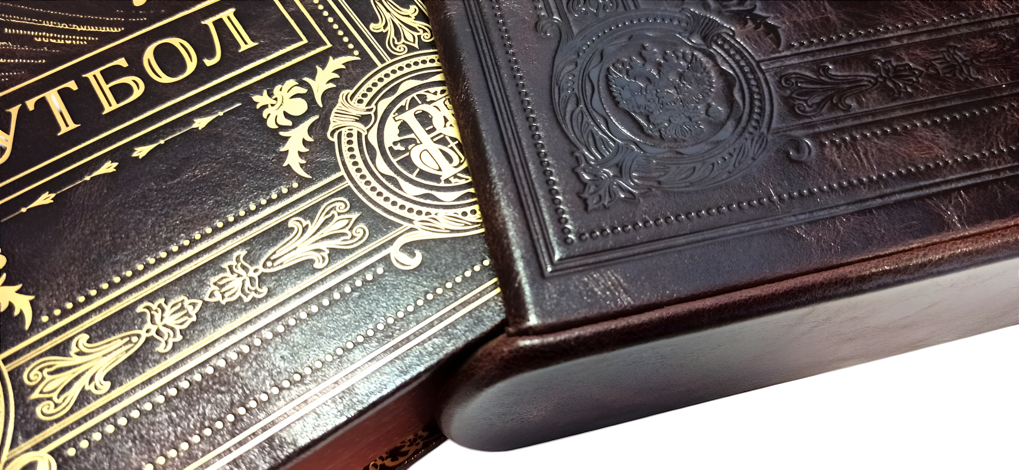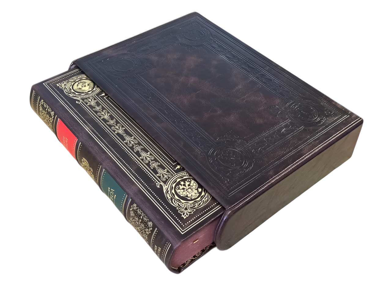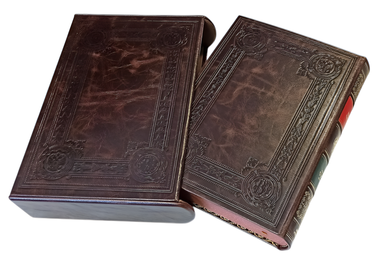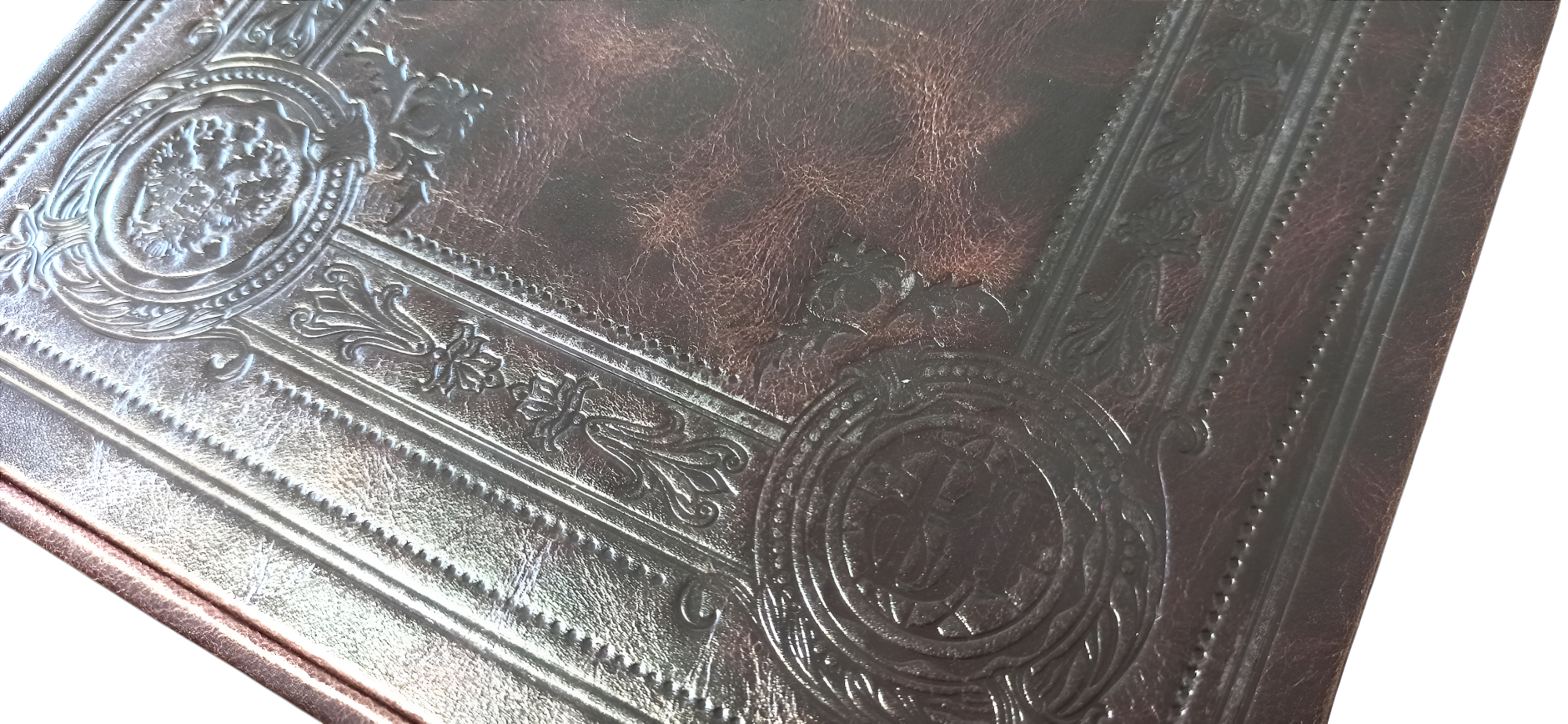 Дизайн включает в себя оригинальное сочетание блинтового, золотого и цветного тиснения, выполненных на высококачественной натуральной коже, а также богато оформленными дюблюрами составными форзацами.