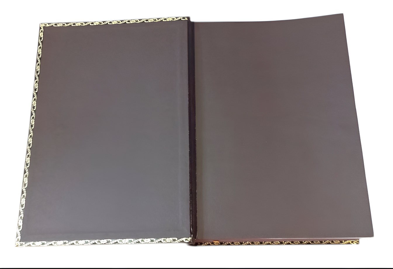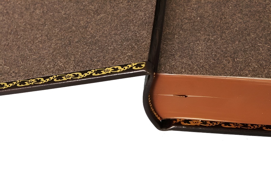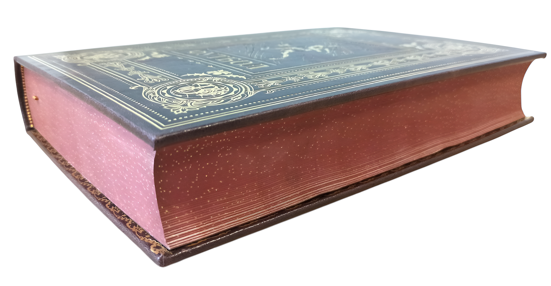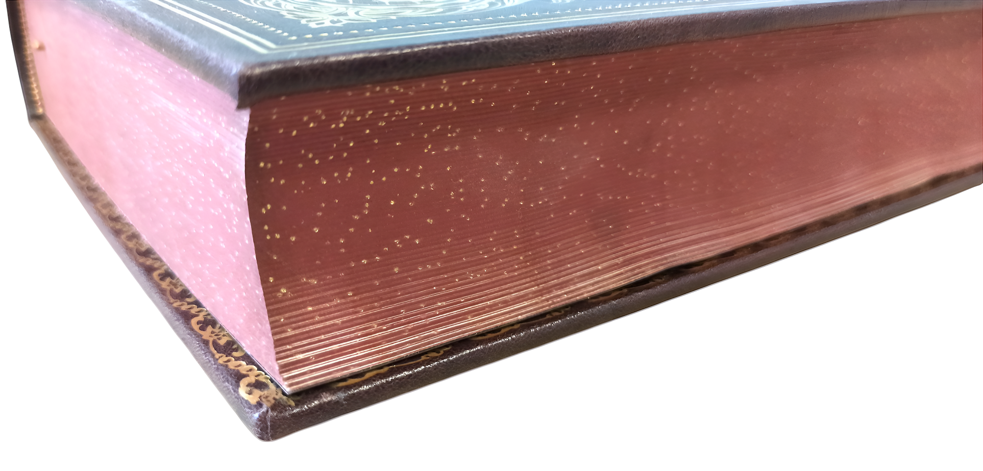 Дизайн включает в себя оригинальное сочетание блинтового, золотого и цветного тиснения, выполненных на высококачественной натуральной коже, а также богато оформленными дюблюрами составными форзацами.