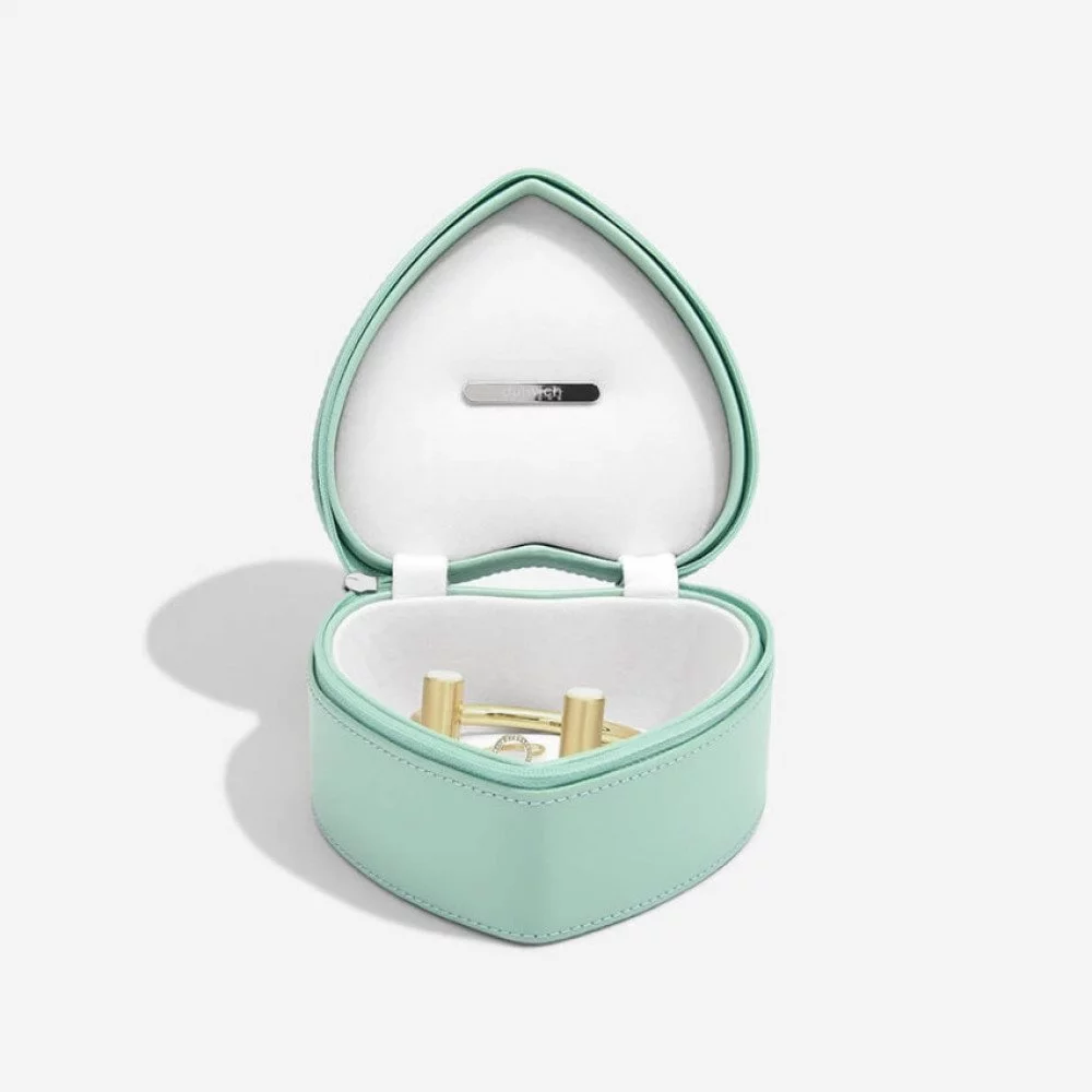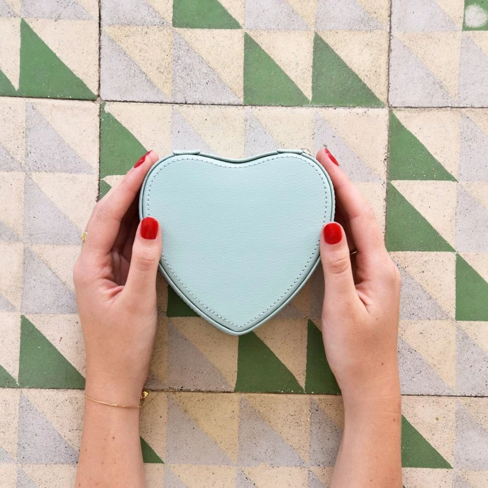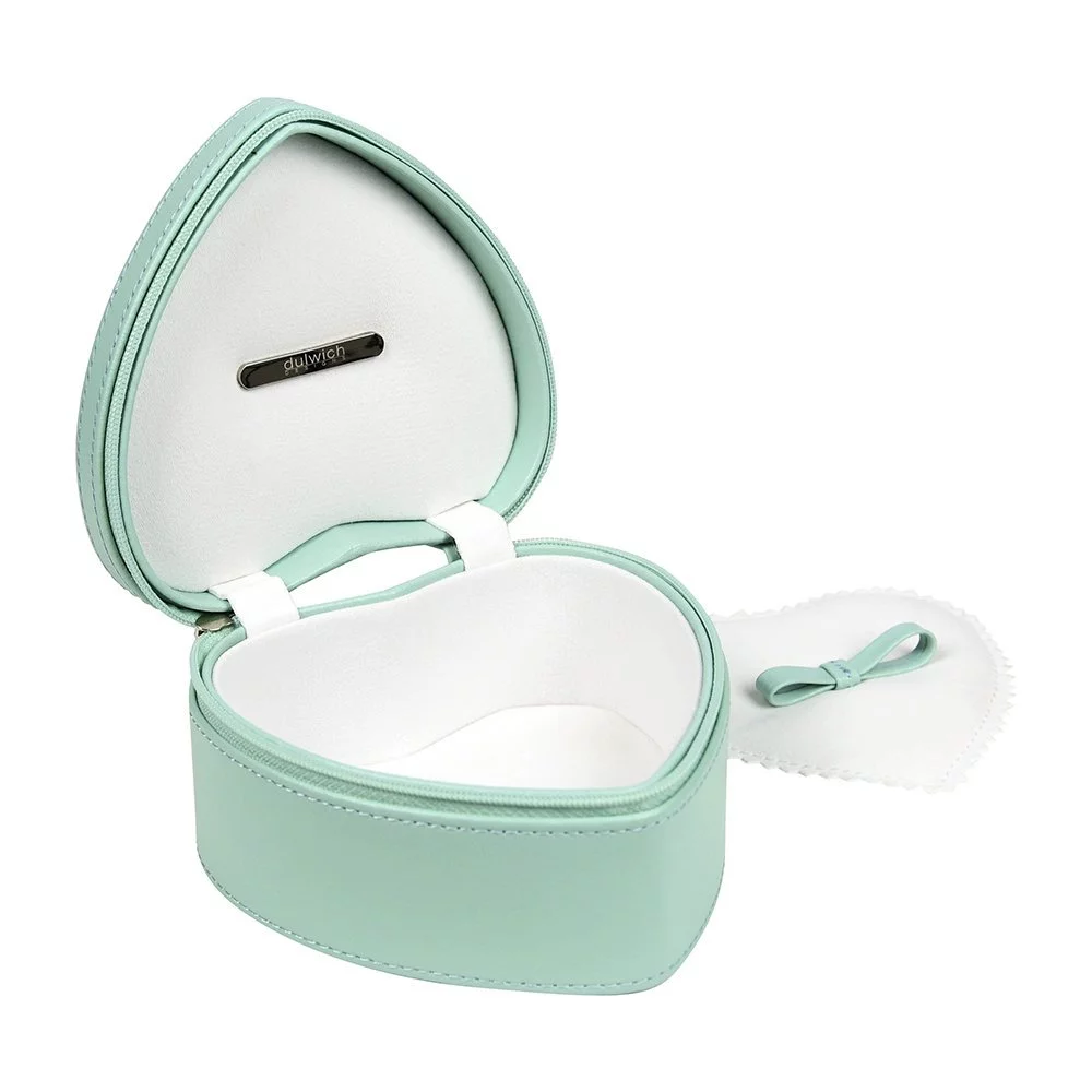 Футляр в форме сердца Dulwich для хранения украшений с внешней отделкой из натуральной кожи нежного мятного цвета.