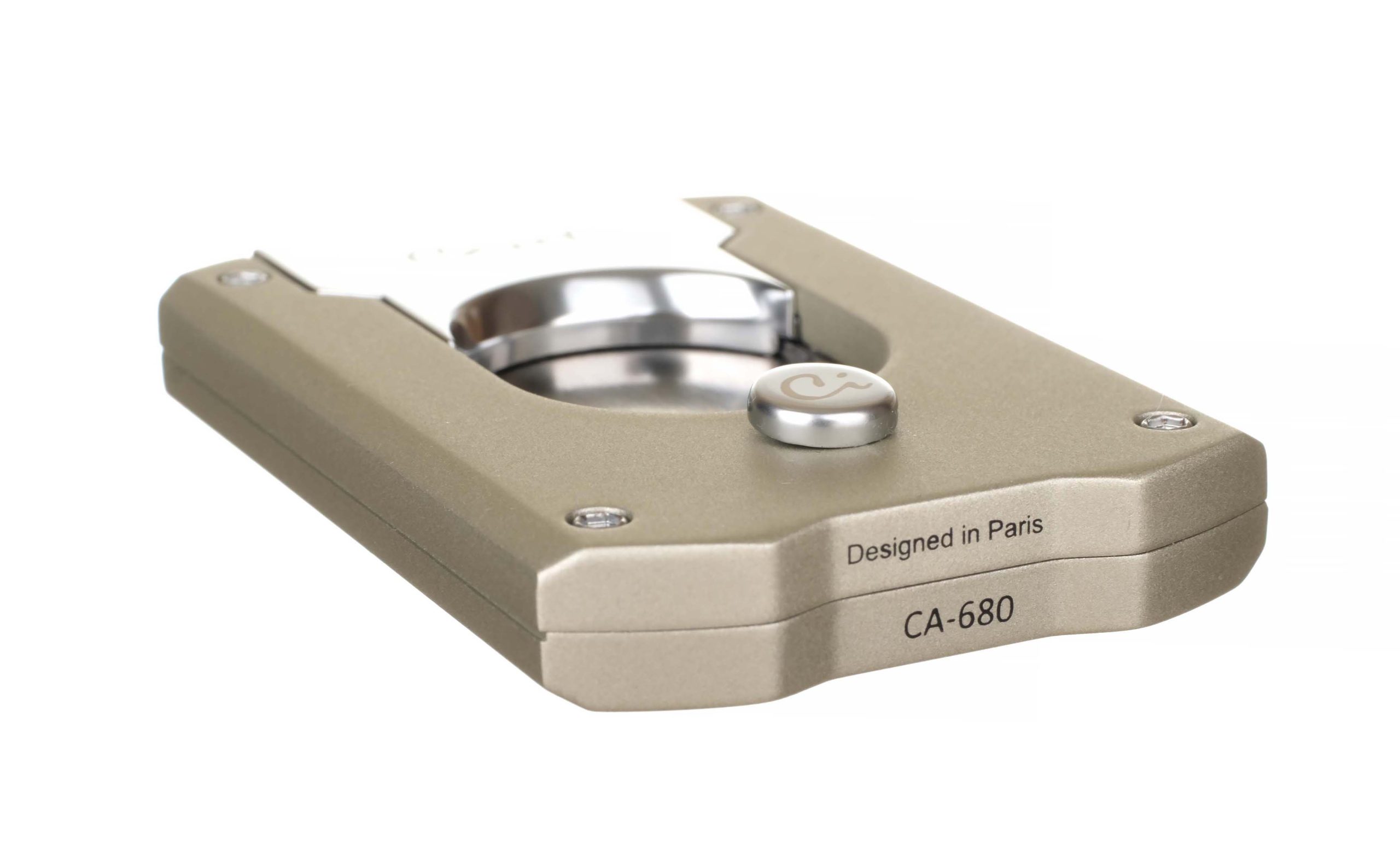Действует по традиционному принципу гильотин — двойное лезвие в металлическом корпусе раскрывается пластинчатой пружиной при нажатии на кнопку.