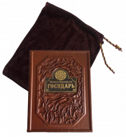 Кожаный переплёт ручной работы, украшен иллюстрированной вставкой из цветного металла.