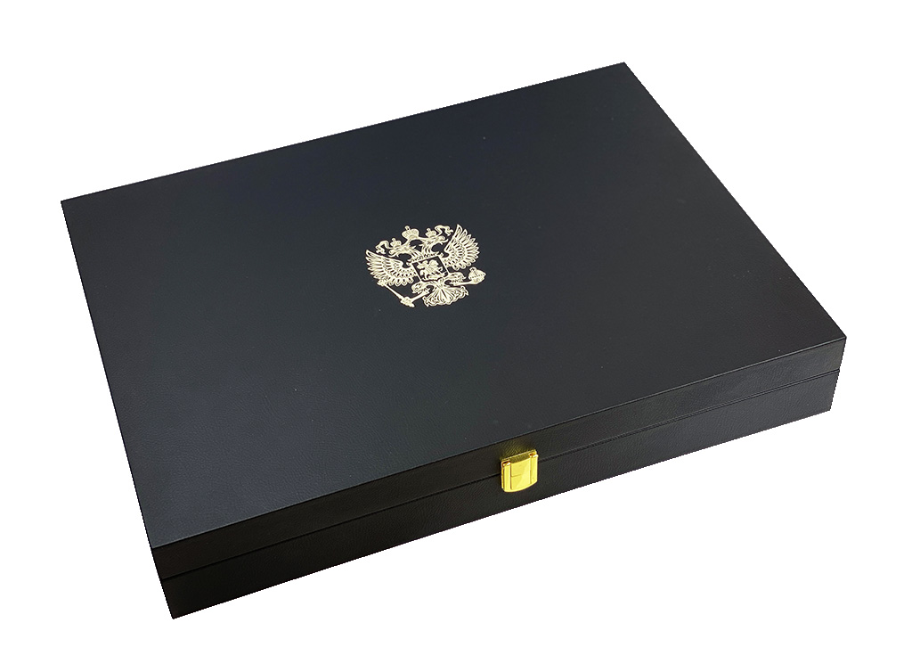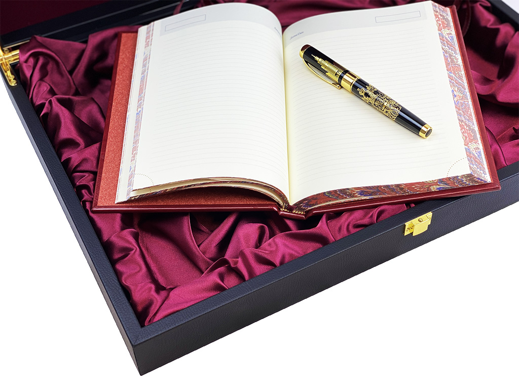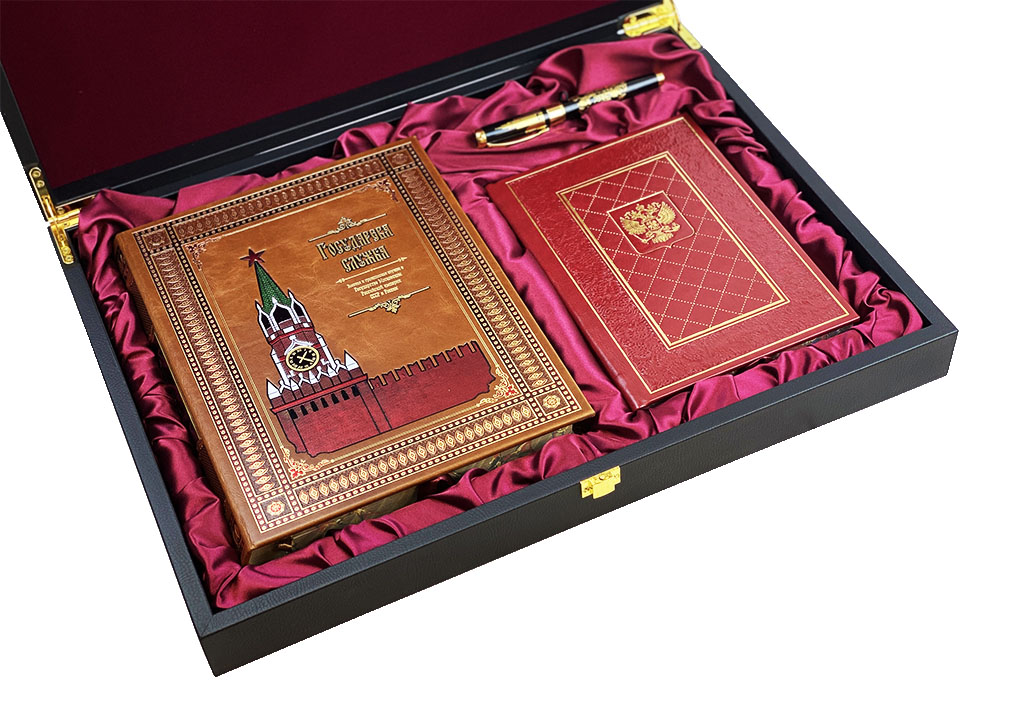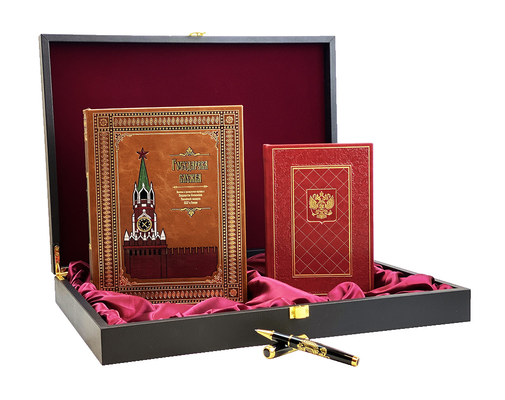 Книга Государева служба в кожаном переплете ручной работы, ежедневник в кожаном переплете с Гербом, подарочная ручка роллер с металлостикером в виде Герба России и Кремля, оформленных в деревянном футляре с ложементом, обтянутым искусственной кожей высокого качества, футляр украшен металлостикером в виде Герба России.