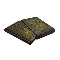 Цельнокожаный переплёт ручной работы, украшен иллюстрированной вставкой из цветного металла.