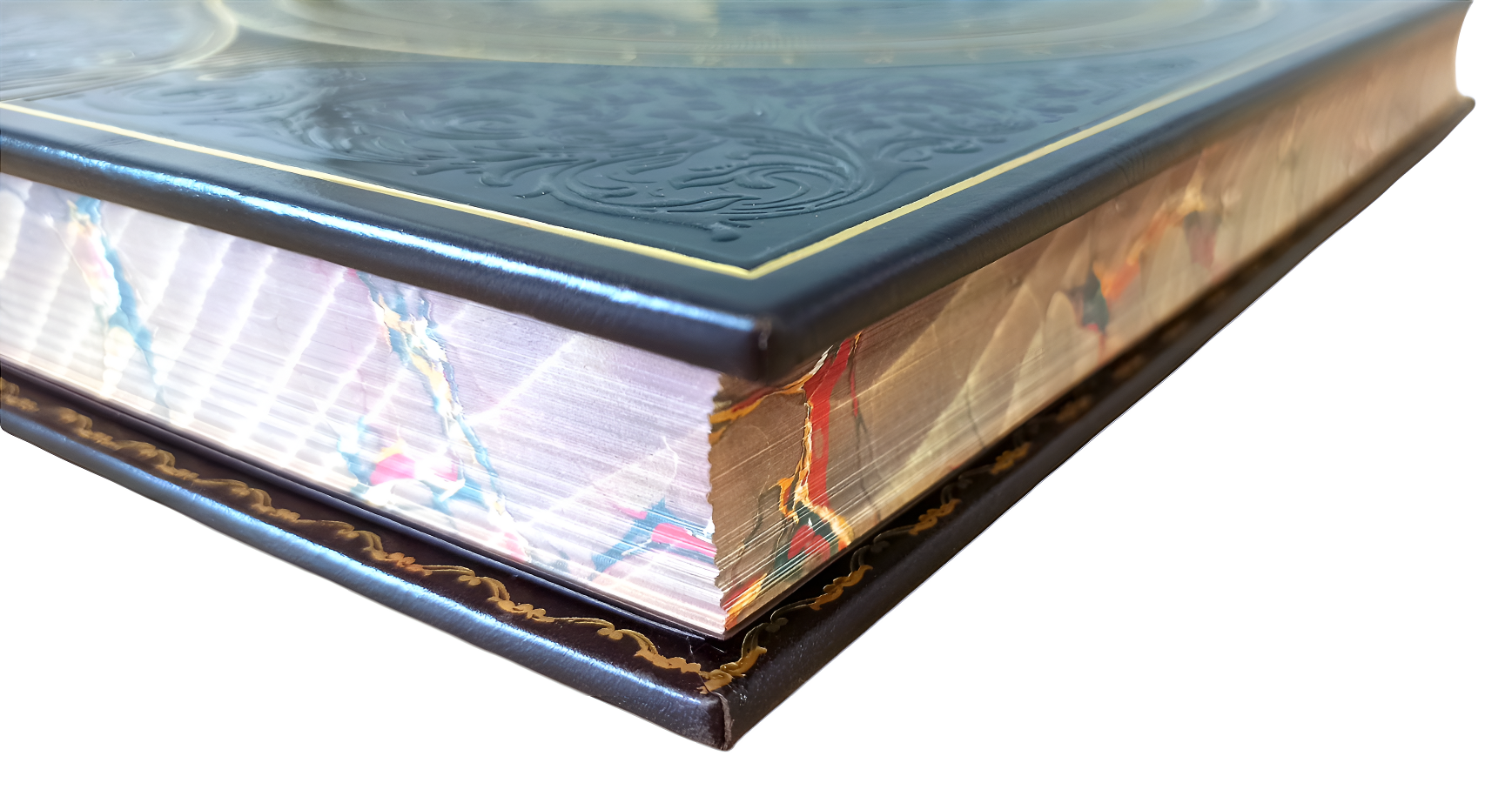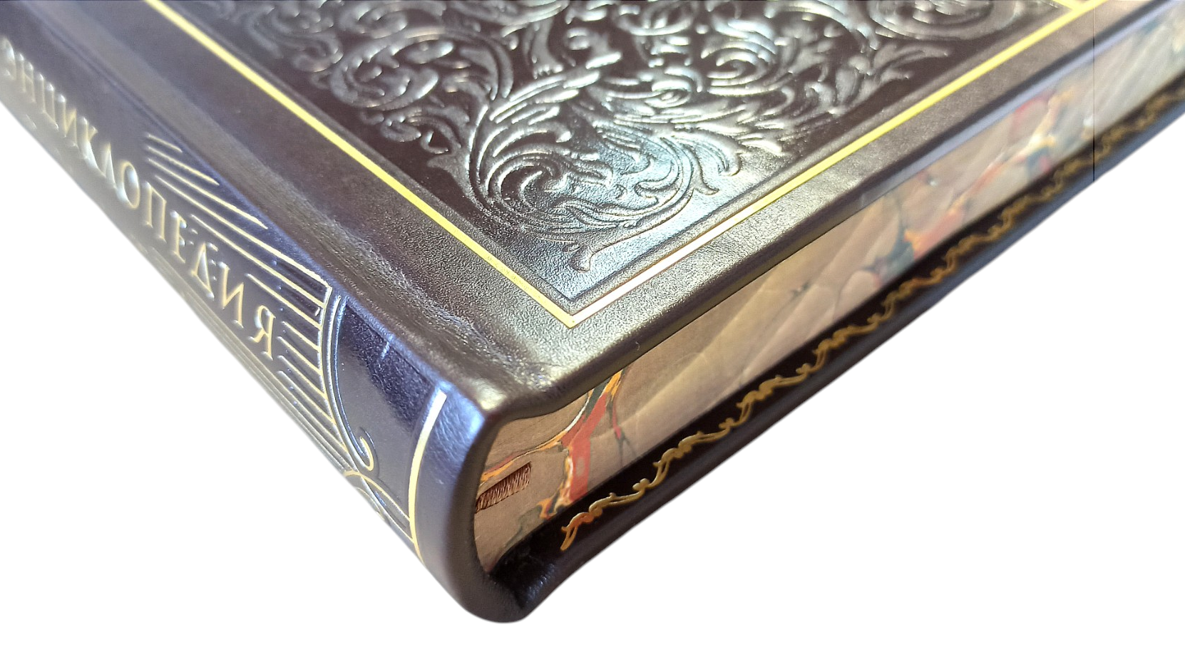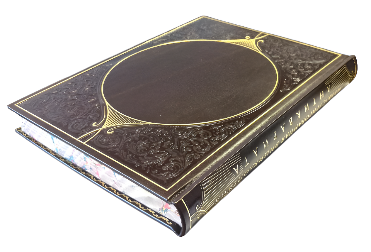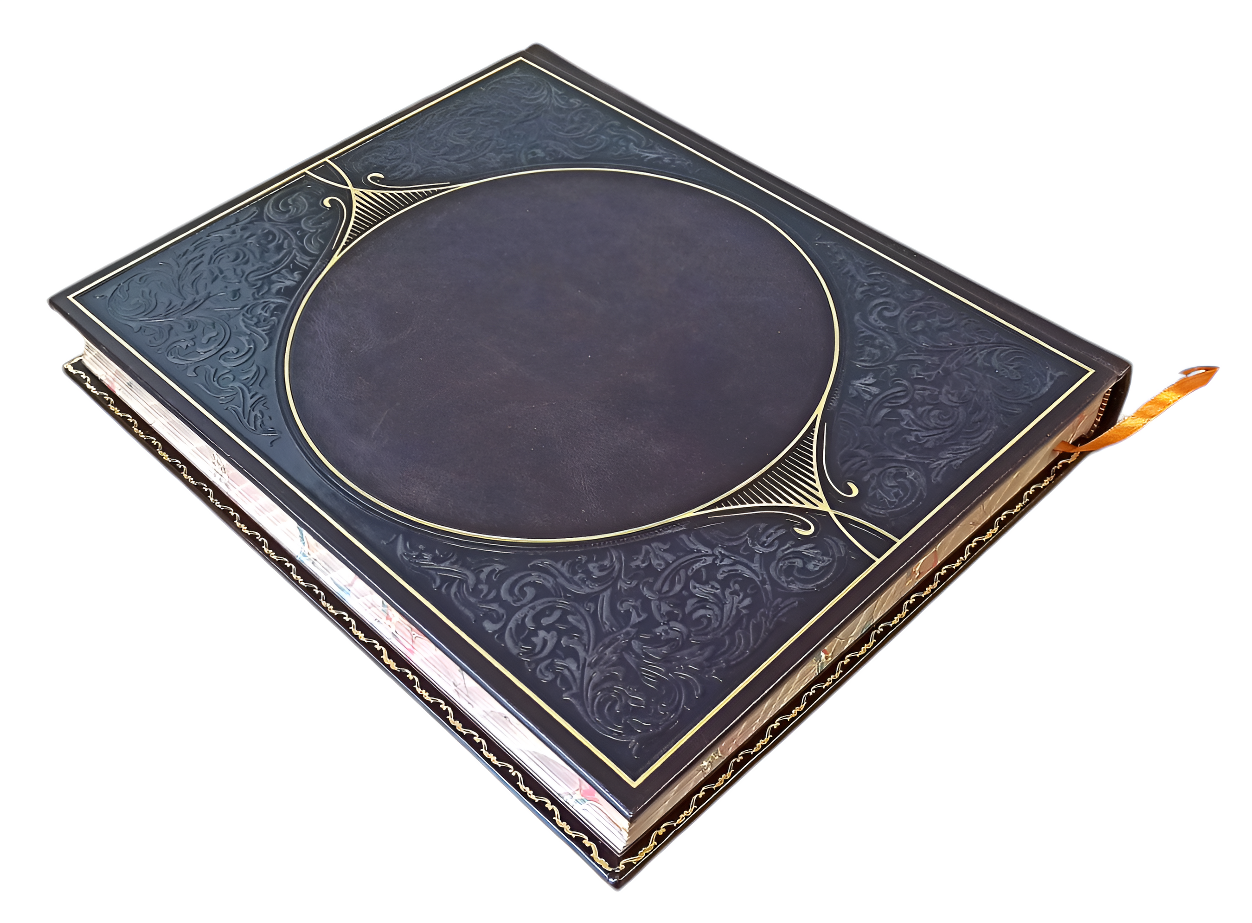 Цельнокожаный переплёт ручной работы, украшен блинтовым и золотым тиснением.