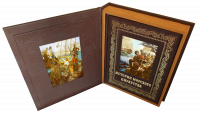 Цельнокожаный переплёт ручной работы, украшен иллюстрированной вставкой из цветного металла.